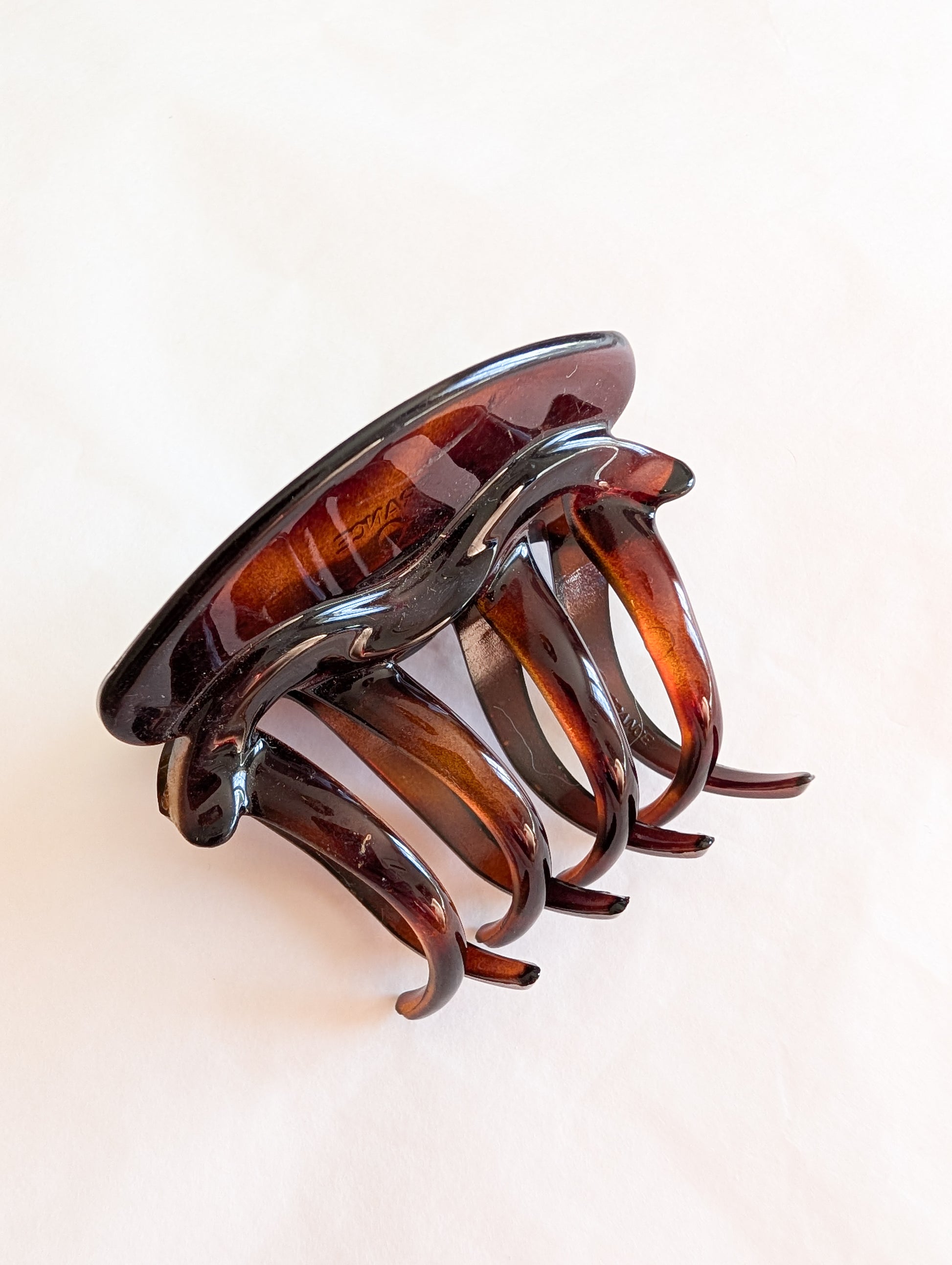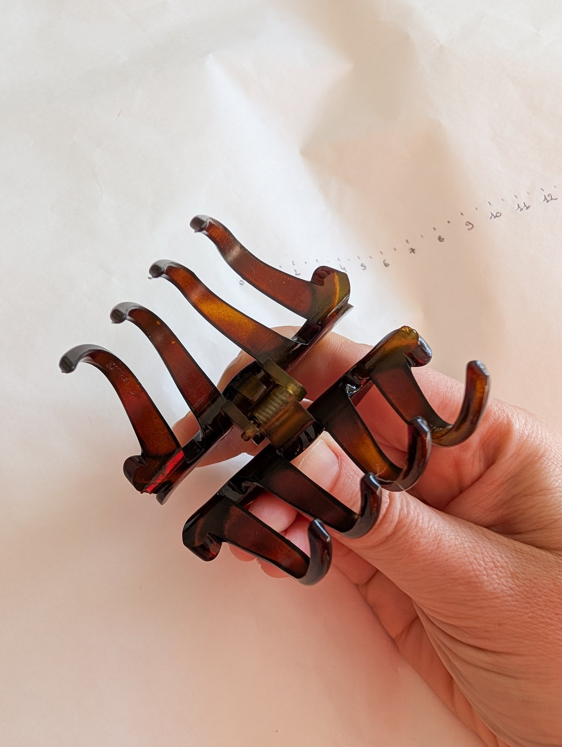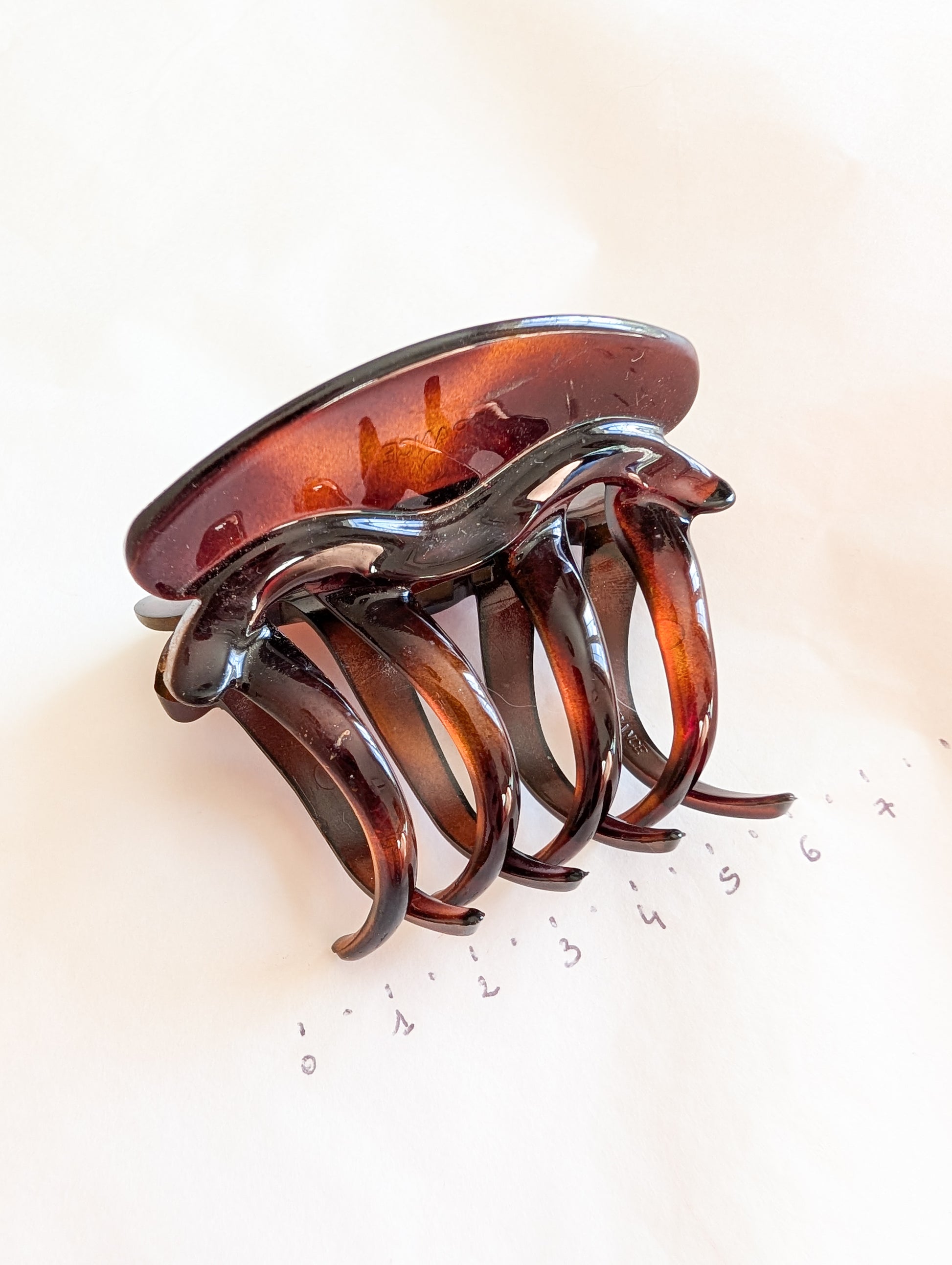 La pièce provient du stock d'un atelier de fabrication de barrettes et bijoux de cheveux situé dans le Jura. Le Jura est le berceau de l'industrie du plastique français. On y fabrique des pièces de très grande qualité.