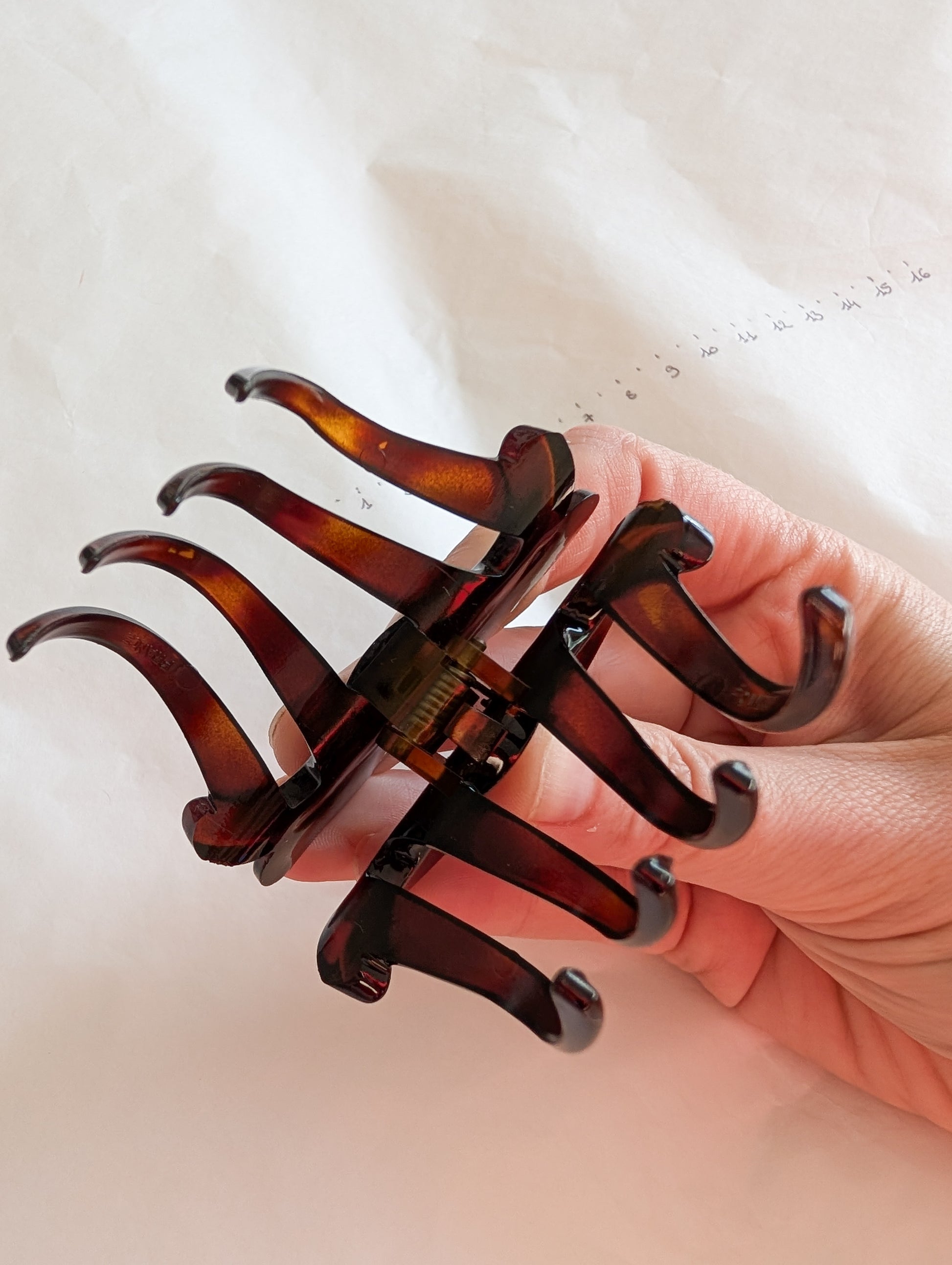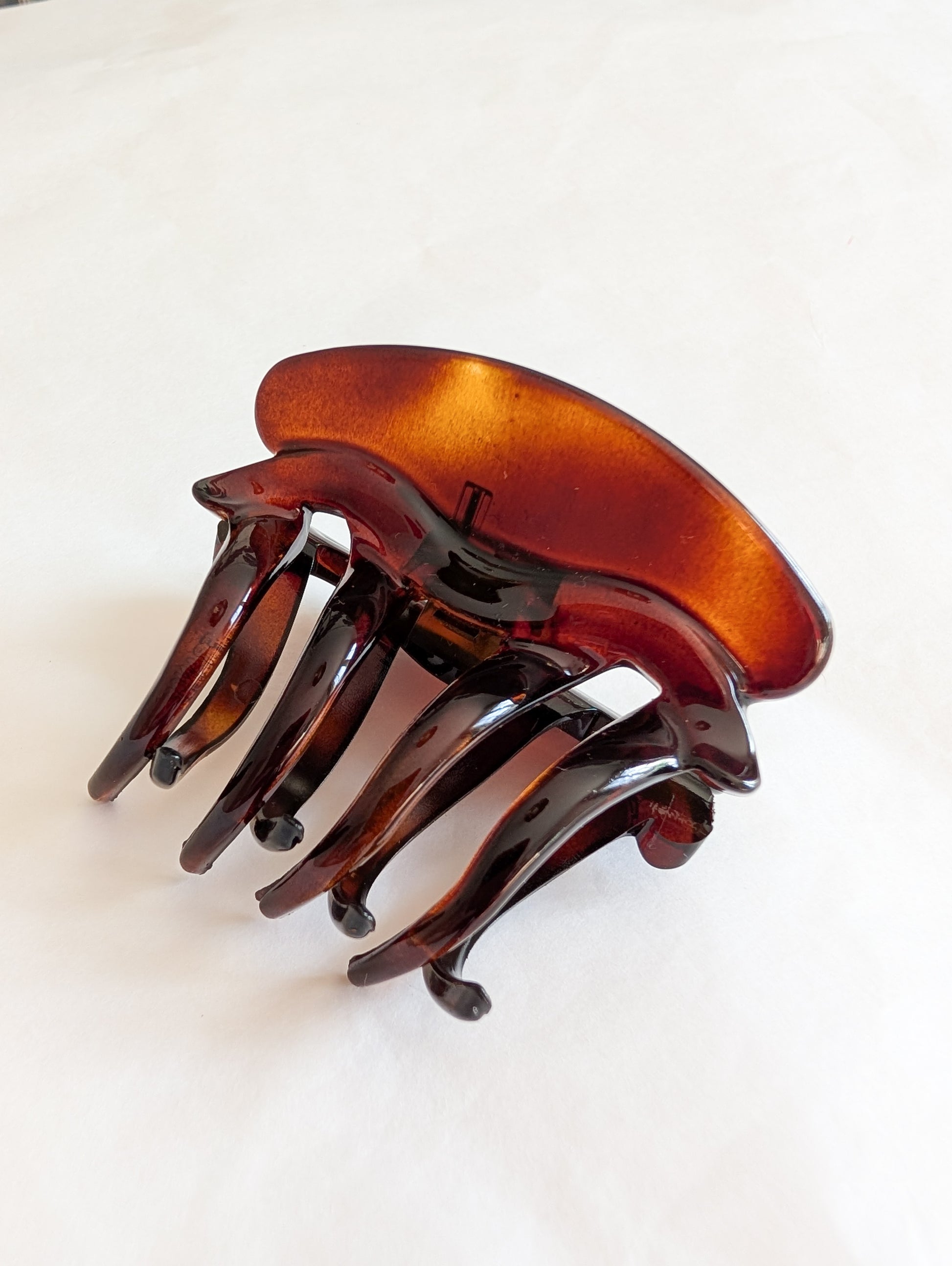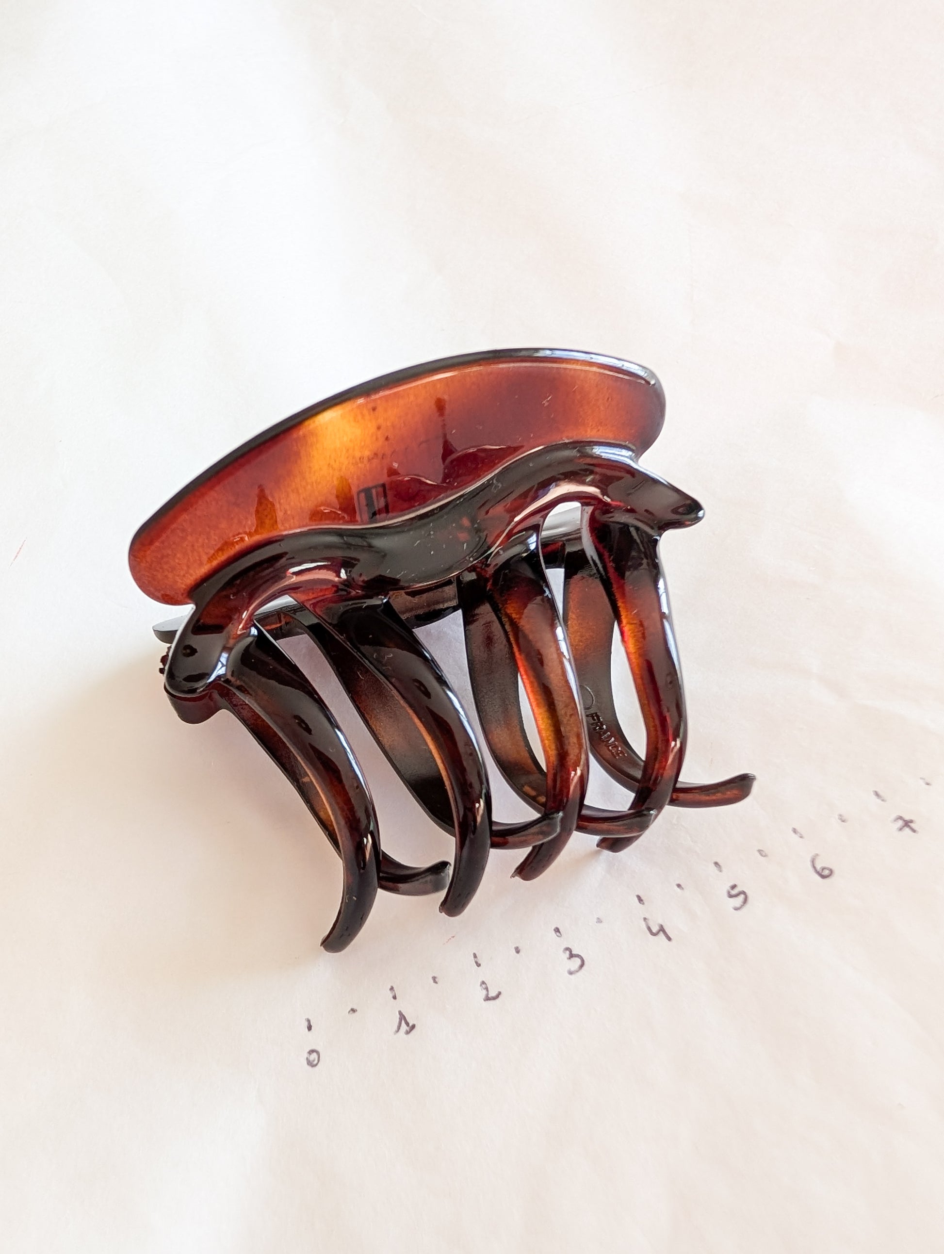 La pièce provient du stock d'un atelier de fabrication de barrettes et bijoux de cheveux situé dans le Jura. Le Jura est le berceau de l'industrie du plastique français. On y fabrique des pièces de très grande qualité.