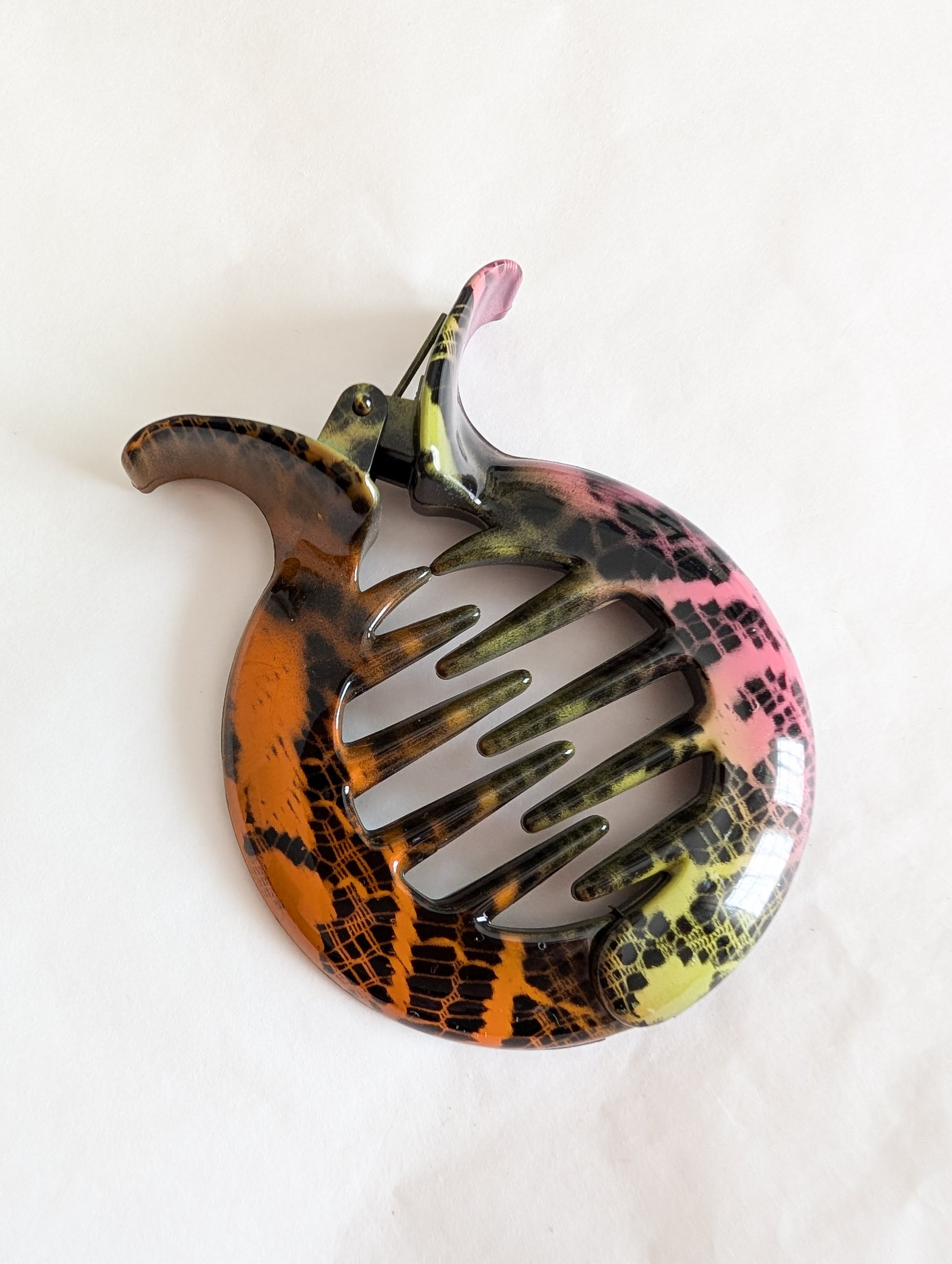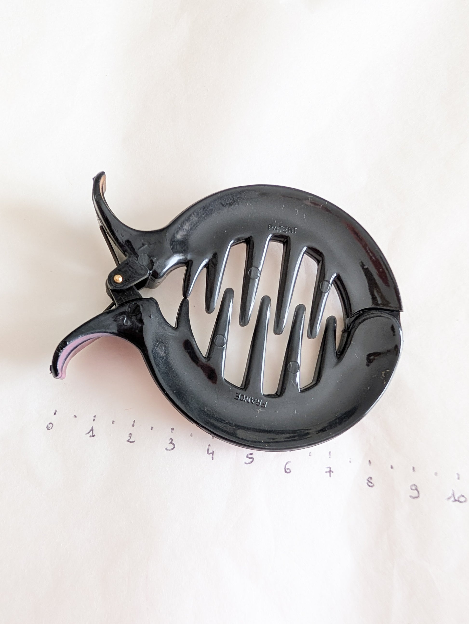 La pièce provient du stock d'un atelier de fabrication de barrettes et bijoux de cheveux situé dans le Jura. Le Jura est le berceau de l'industrie du plastique français. On y fabrique des pièces de très grande qualité.