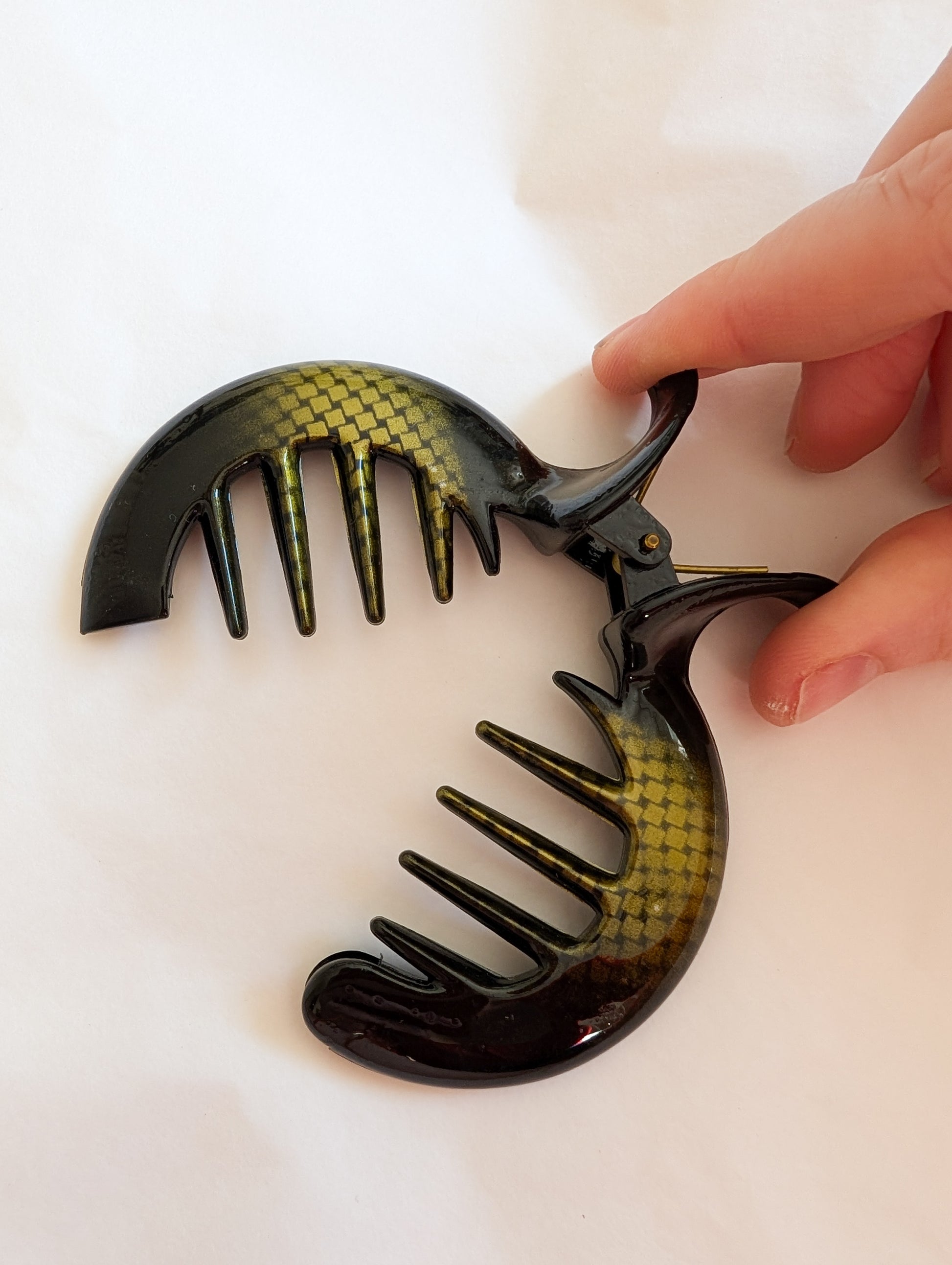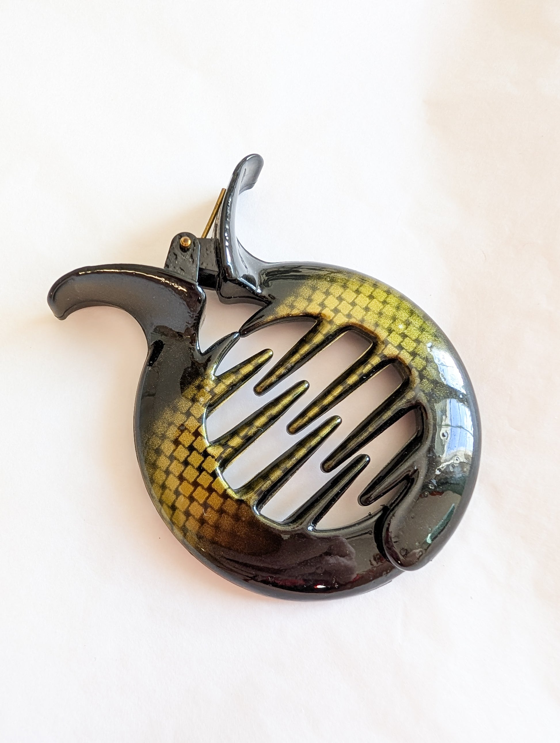 La pièce provient du stock d'un atelier de fabrication de barrettes et bijoux de cheveux situé dans le Jura. Le Jura est le berceau de l'industrie du plastique français. On y fabrique des pièces de très grande qualité.