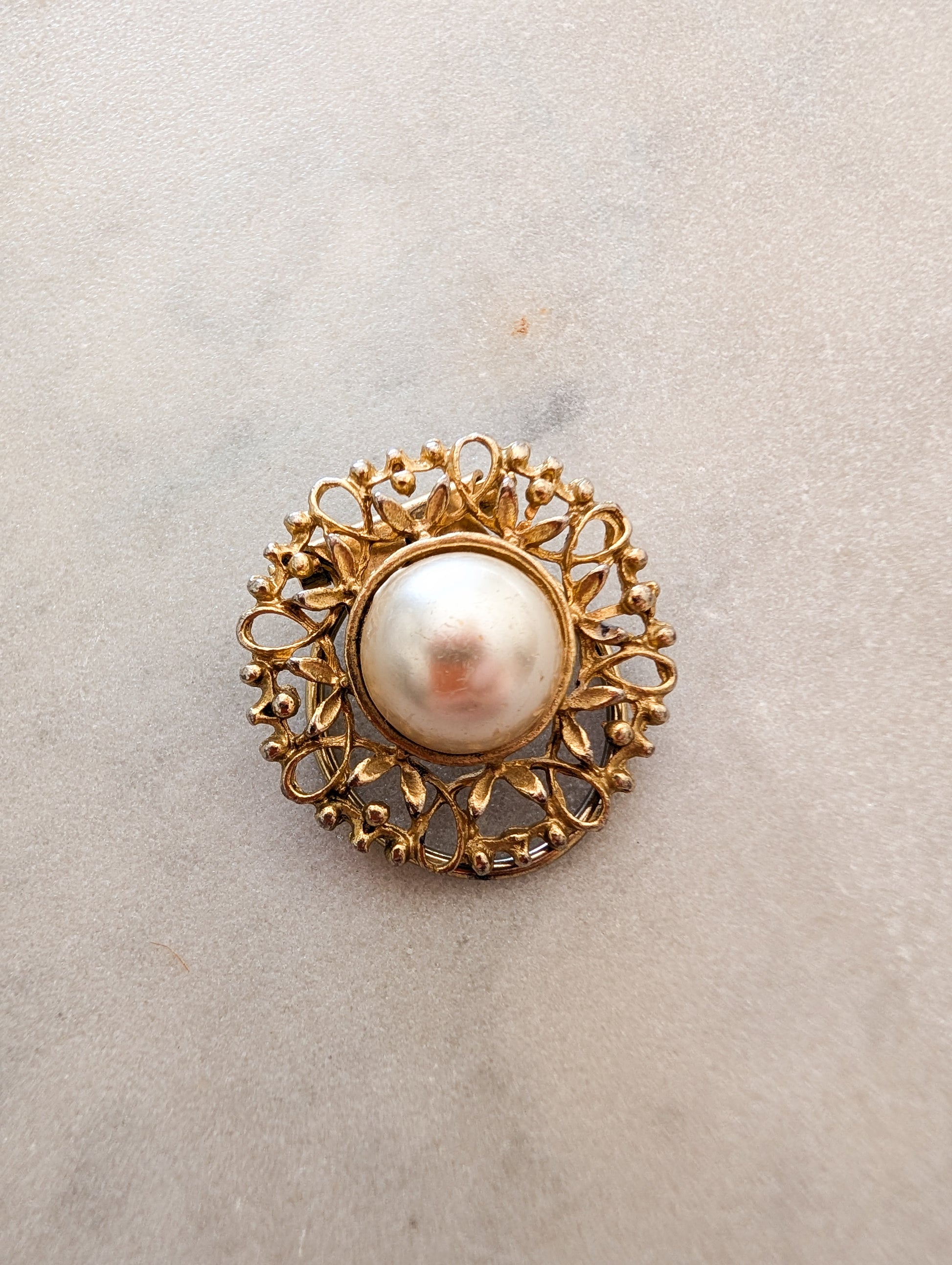 La pince est en métal doré. La perle au centre est nacrée. Quelques très fines rayures.