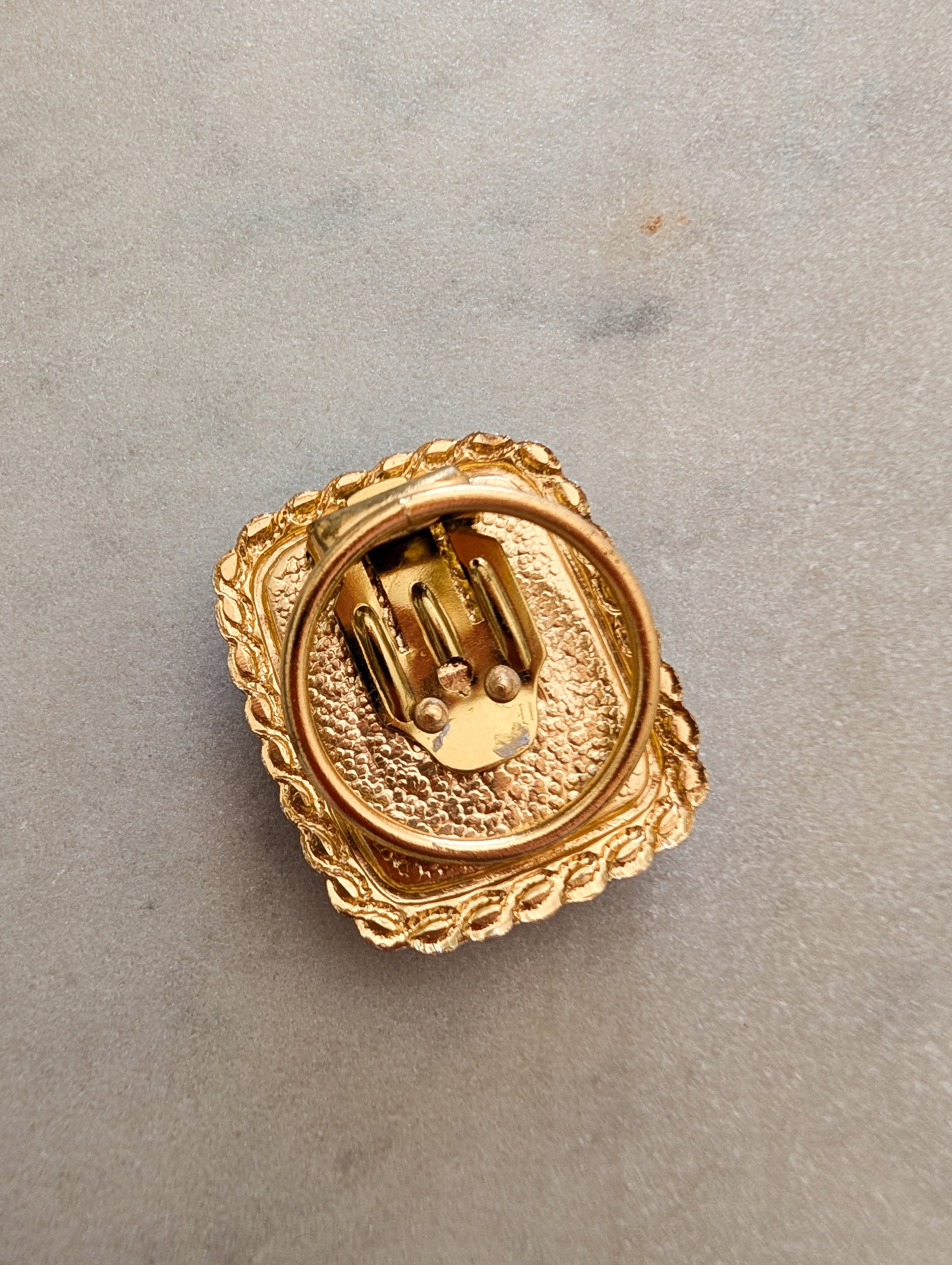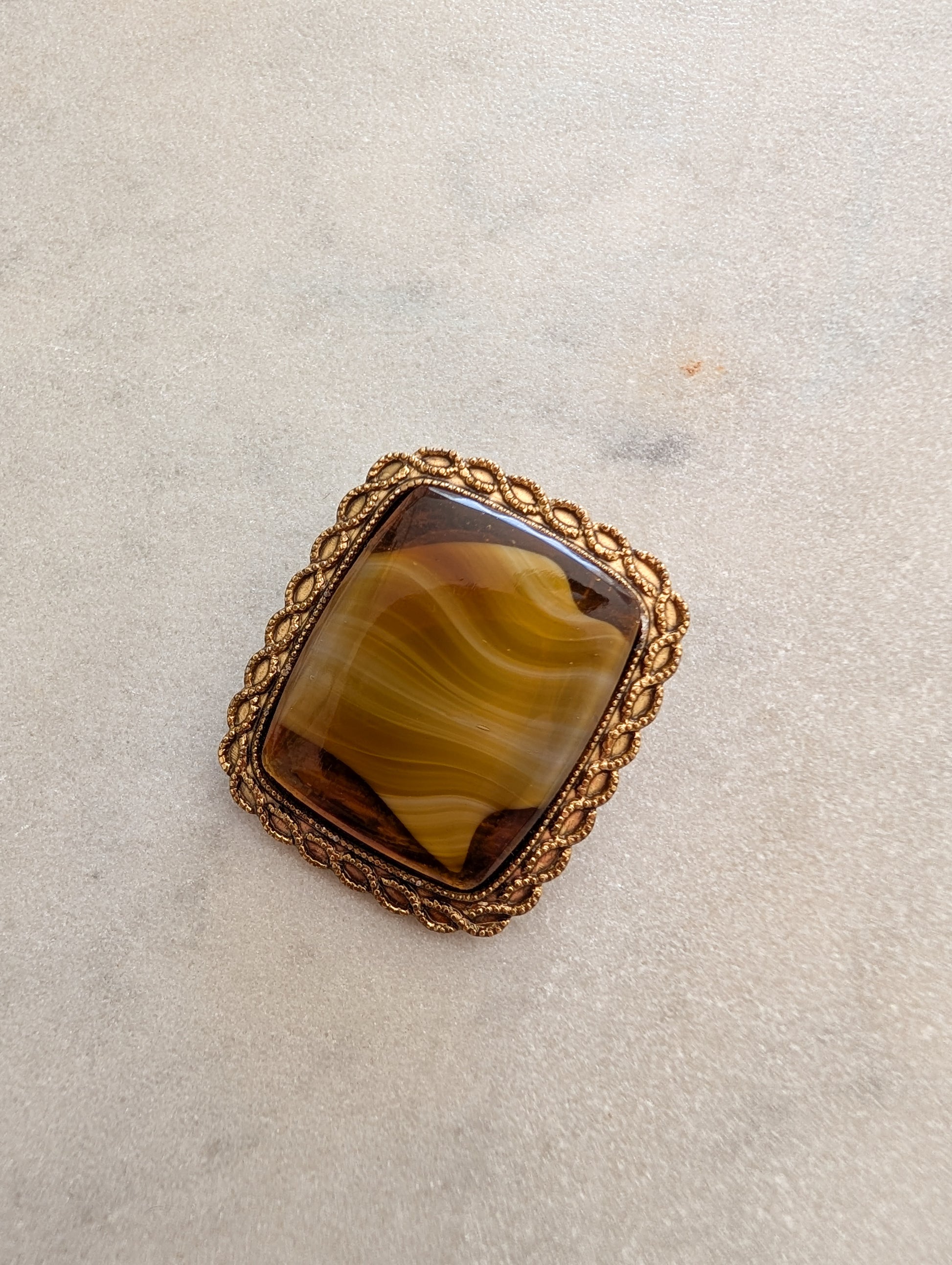La pince est en métal doré, au centre une pierre en verre fumé comme de l'ambre. Très belle qualité.
