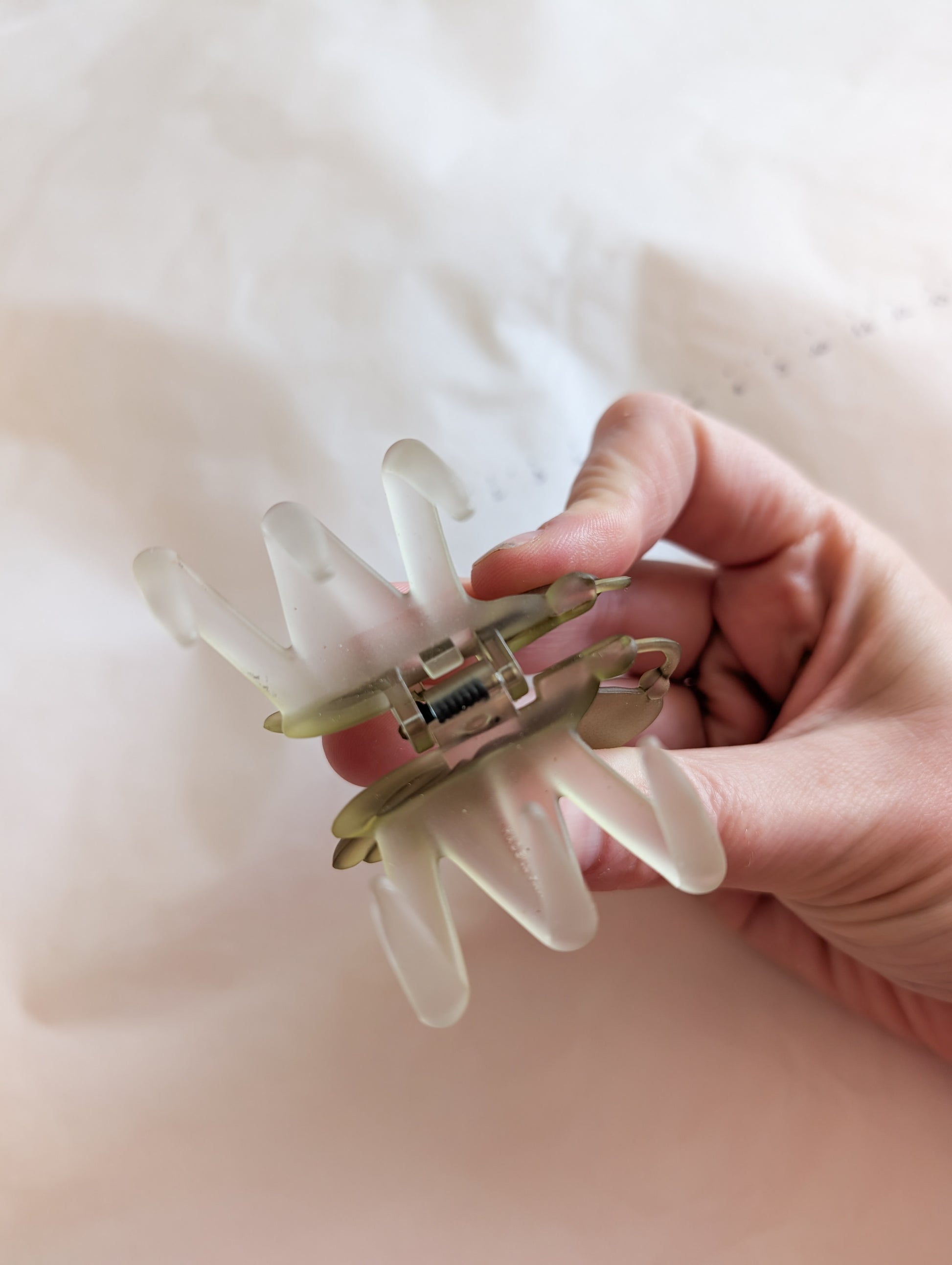 La pièce provient du stock d'un atelier de fabrication de barrettes et bijoux de cheveux situé dans le Jura. Le Jura est le berceau de l'industrie du plastique français. On y fabrique des pièces de très grande qualité.