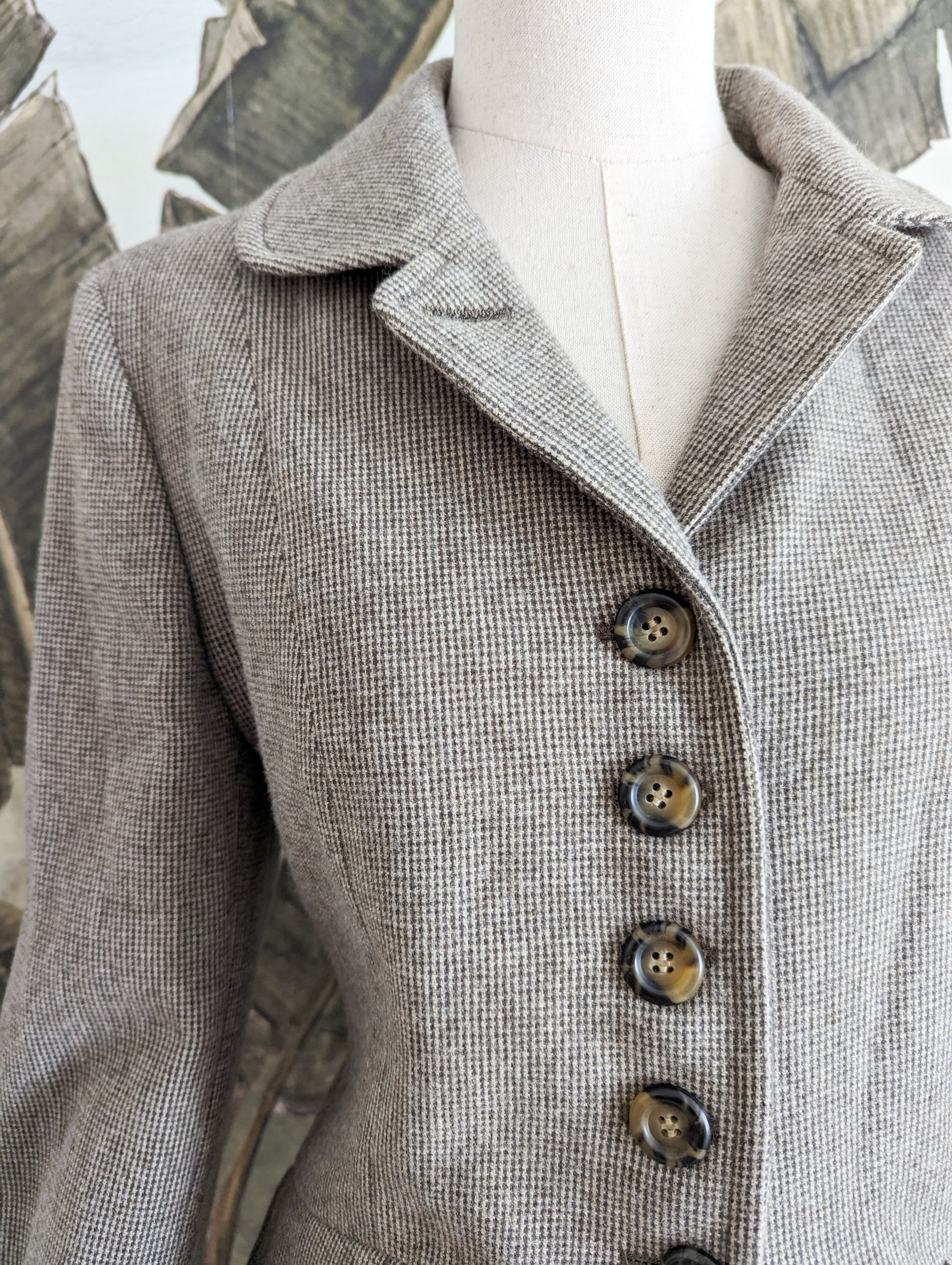 Coupe façon années 40. Les épaules sont joliement dessinées sans être sur dimensionnée, travail de pinces pour marquer la taille, petites poches sur les Hanches.