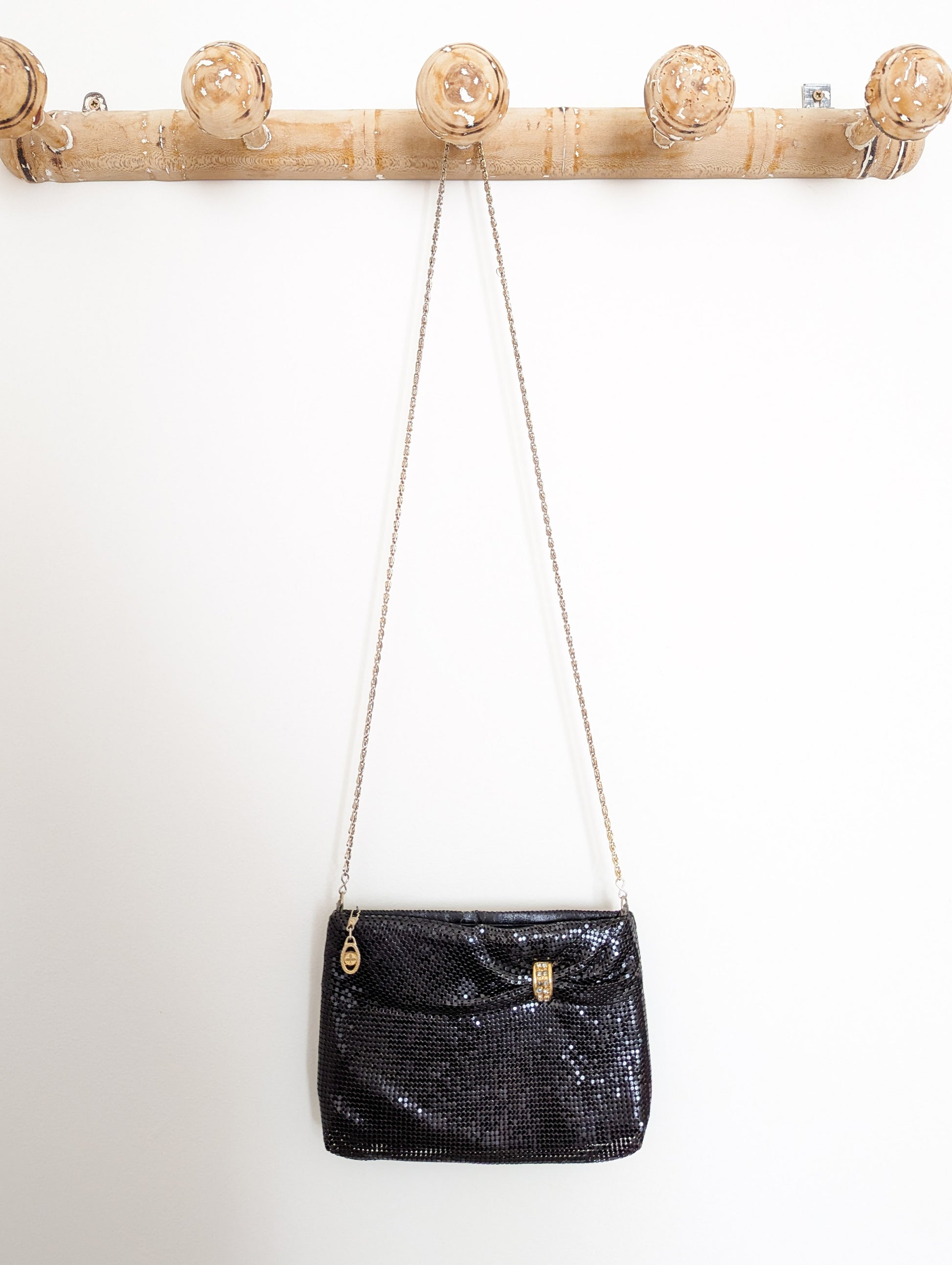 Superbe petit sac datant des années 70. Il se porte à l'épaule ou en bandoulière grâce à sa chaînette.