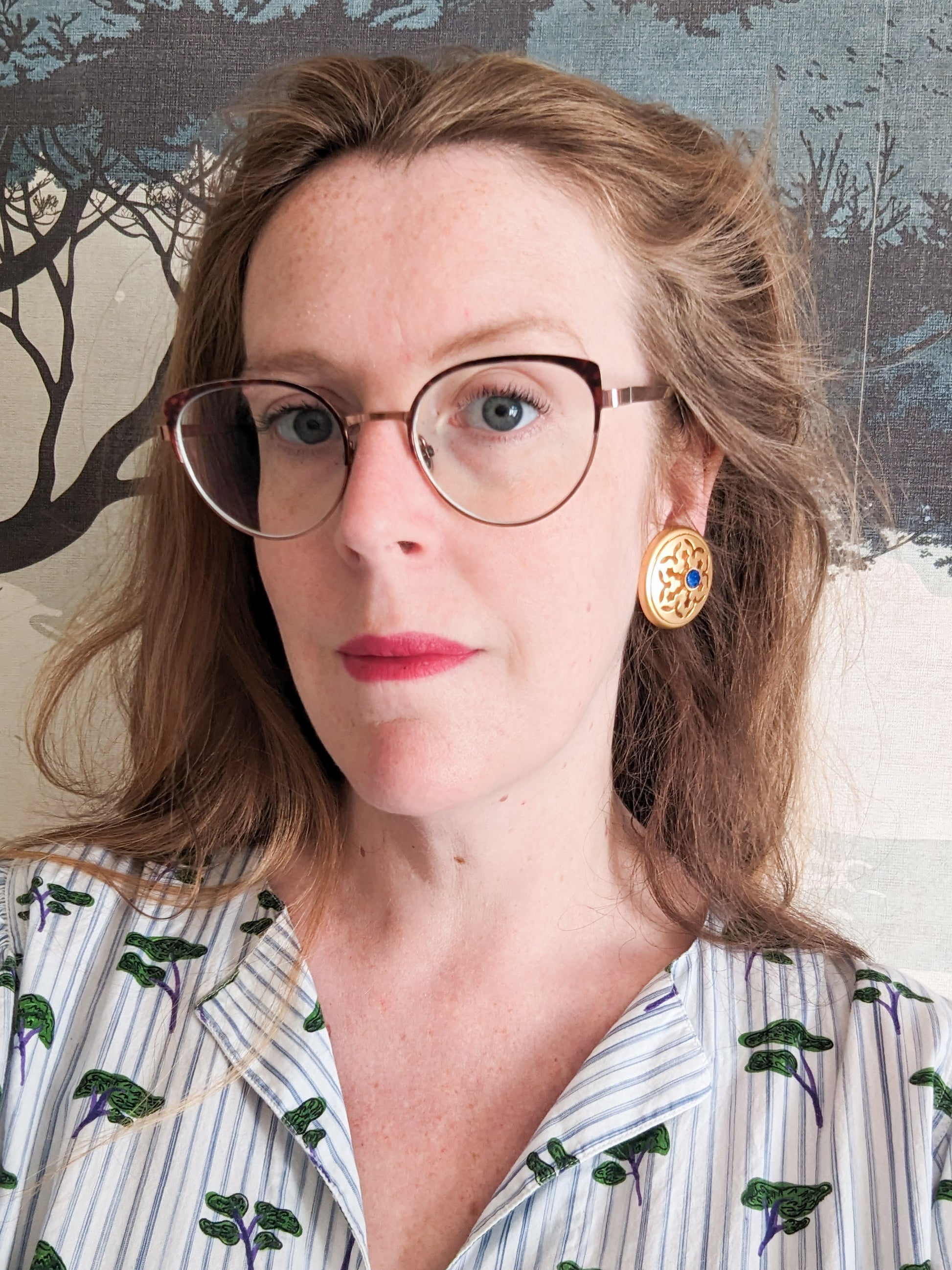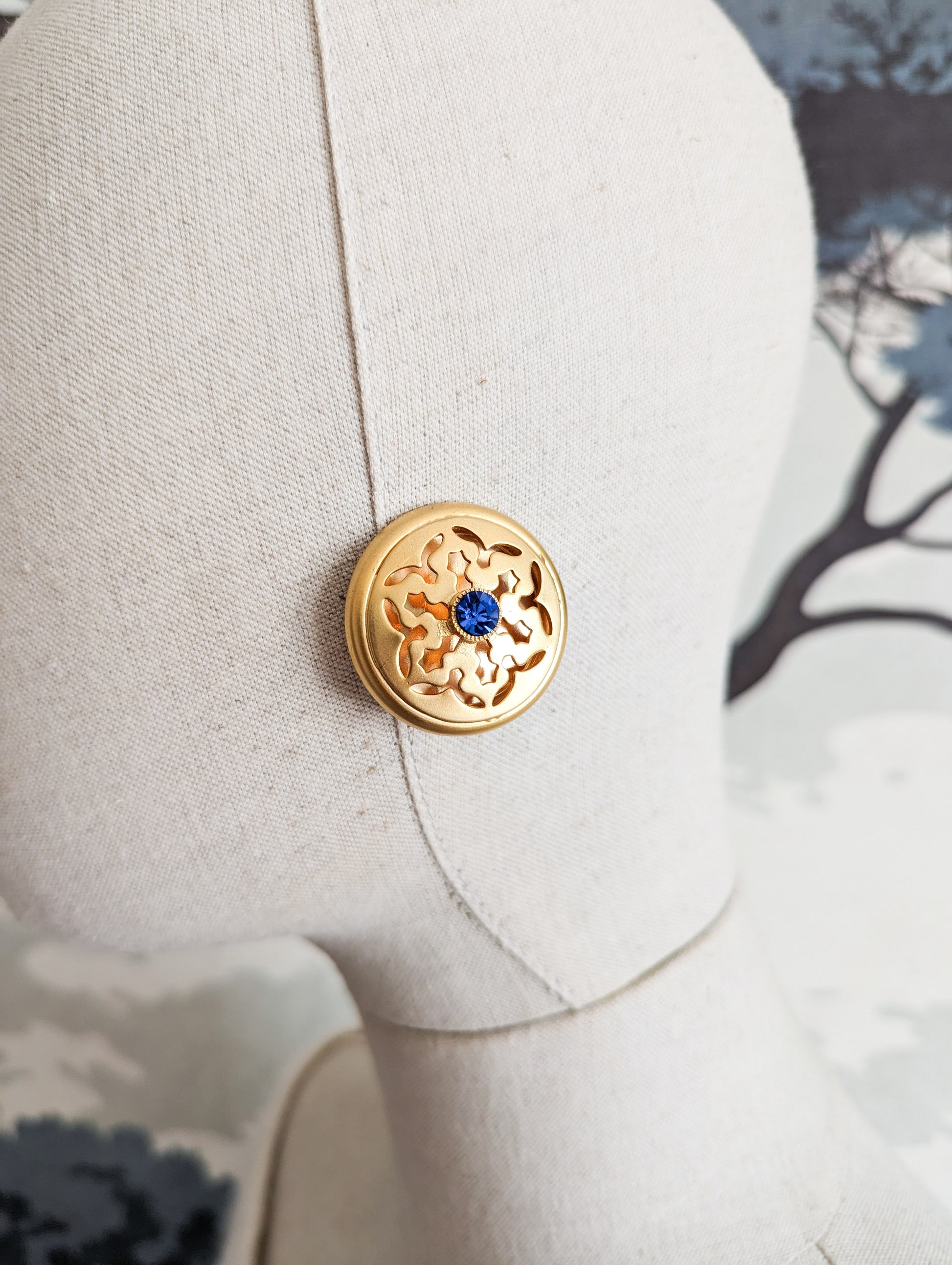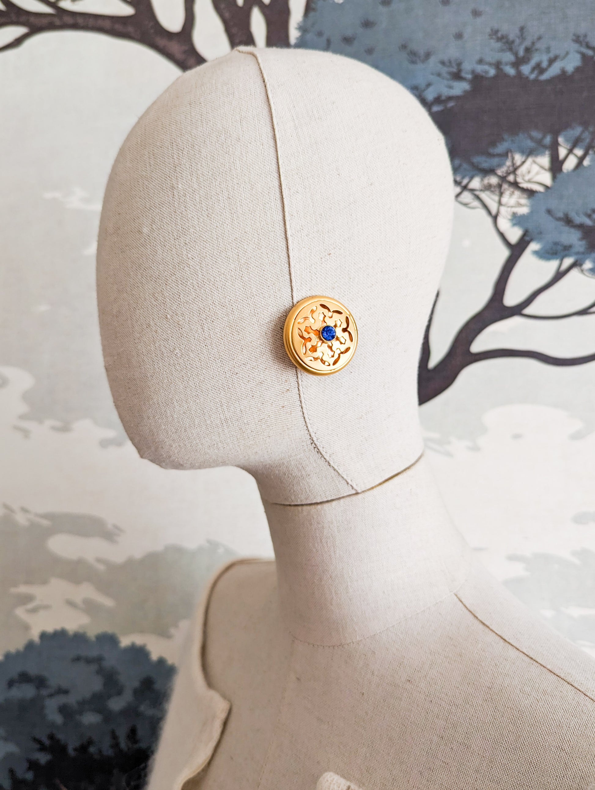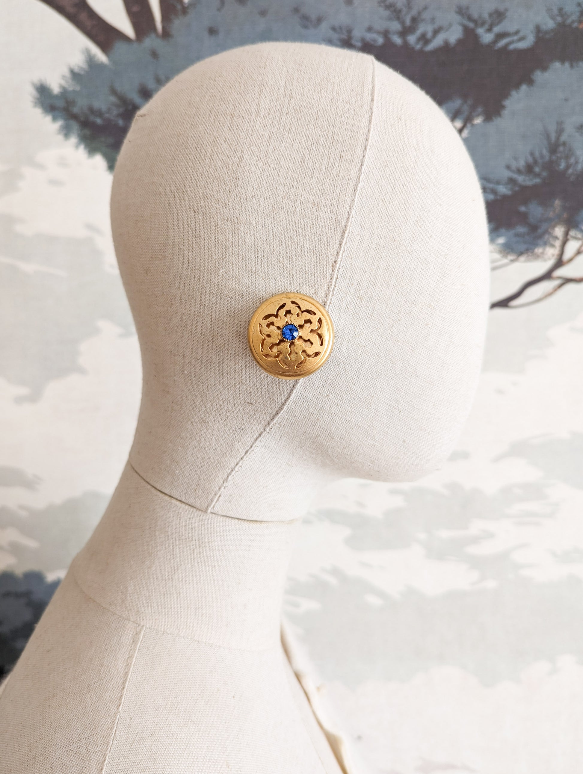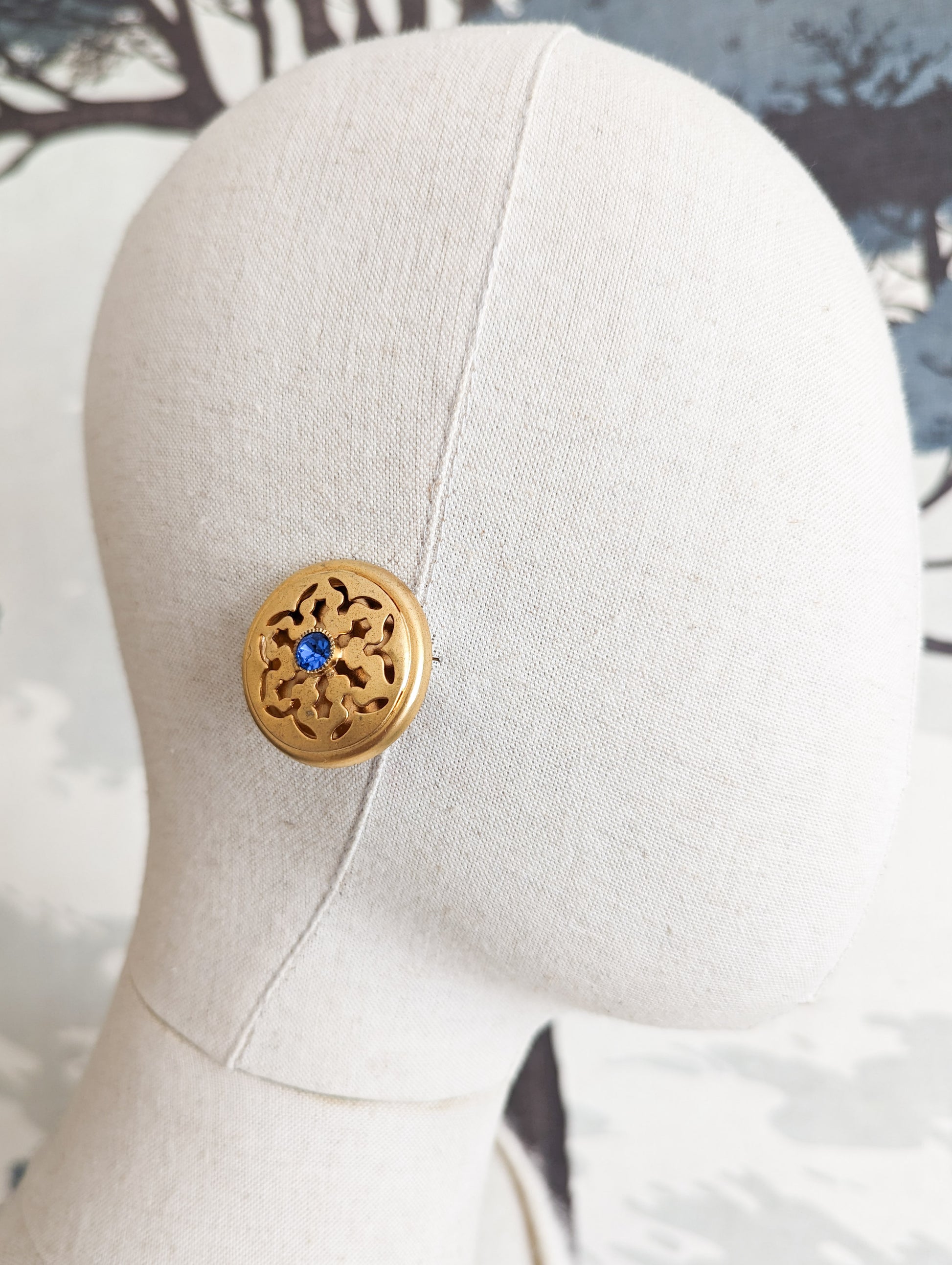 Elles sont en metal doré mat avec un petit strass en verre bleu. Elles sont creuses.