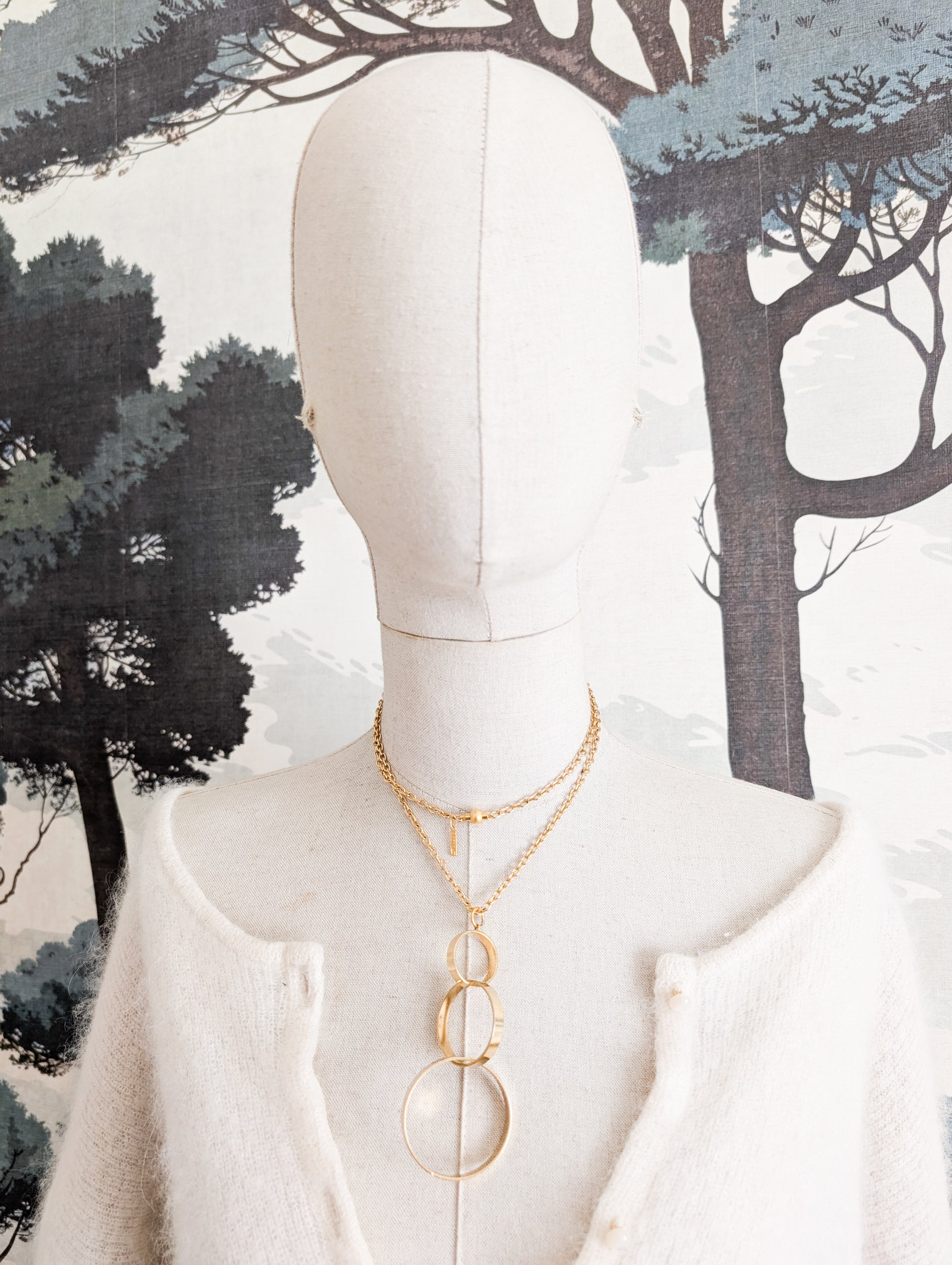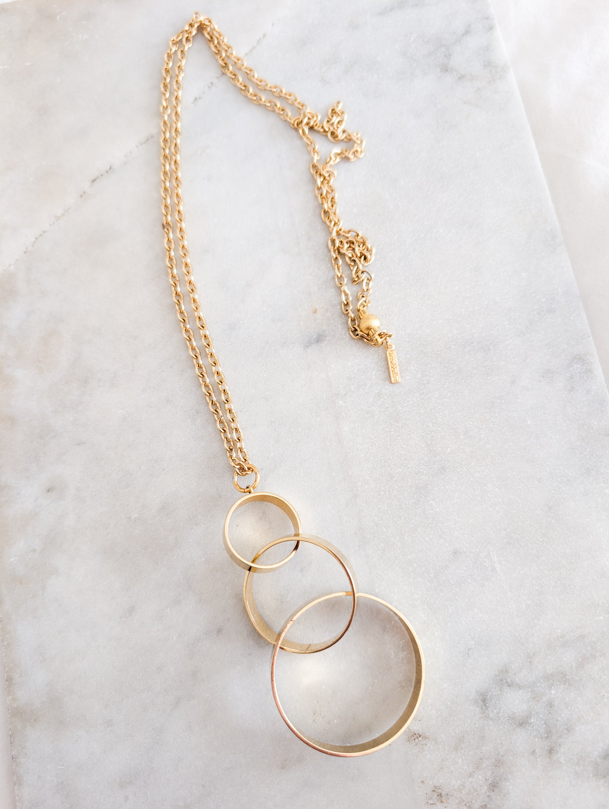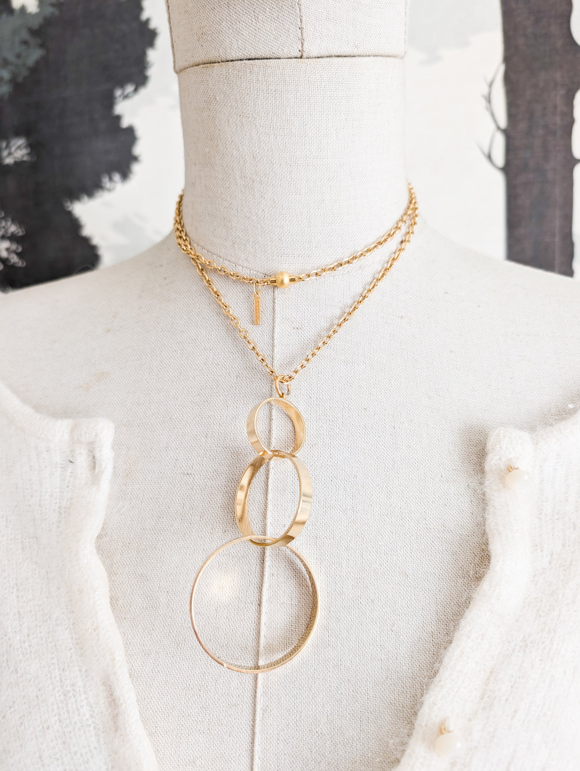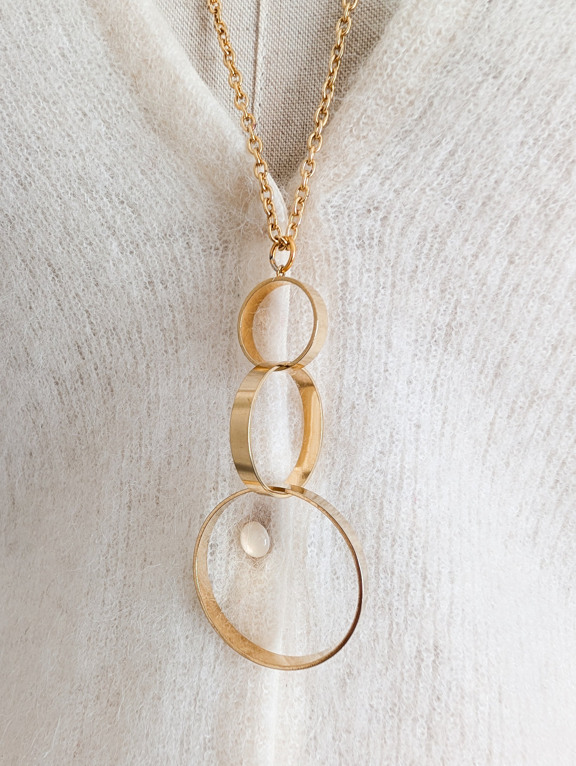 Le sautoir présente une longue chaînette dorée. Très joli pendentif composé de trois anneaux de tailles différentes qui s'entrelacent avec élégance.