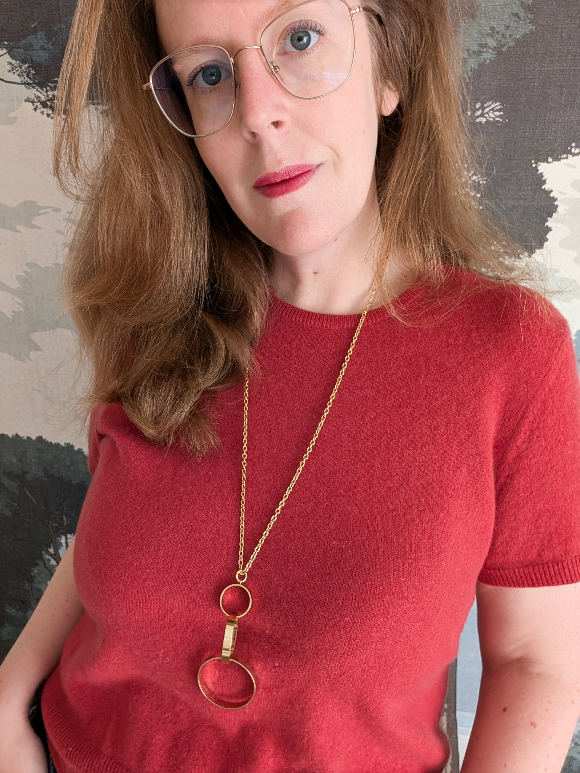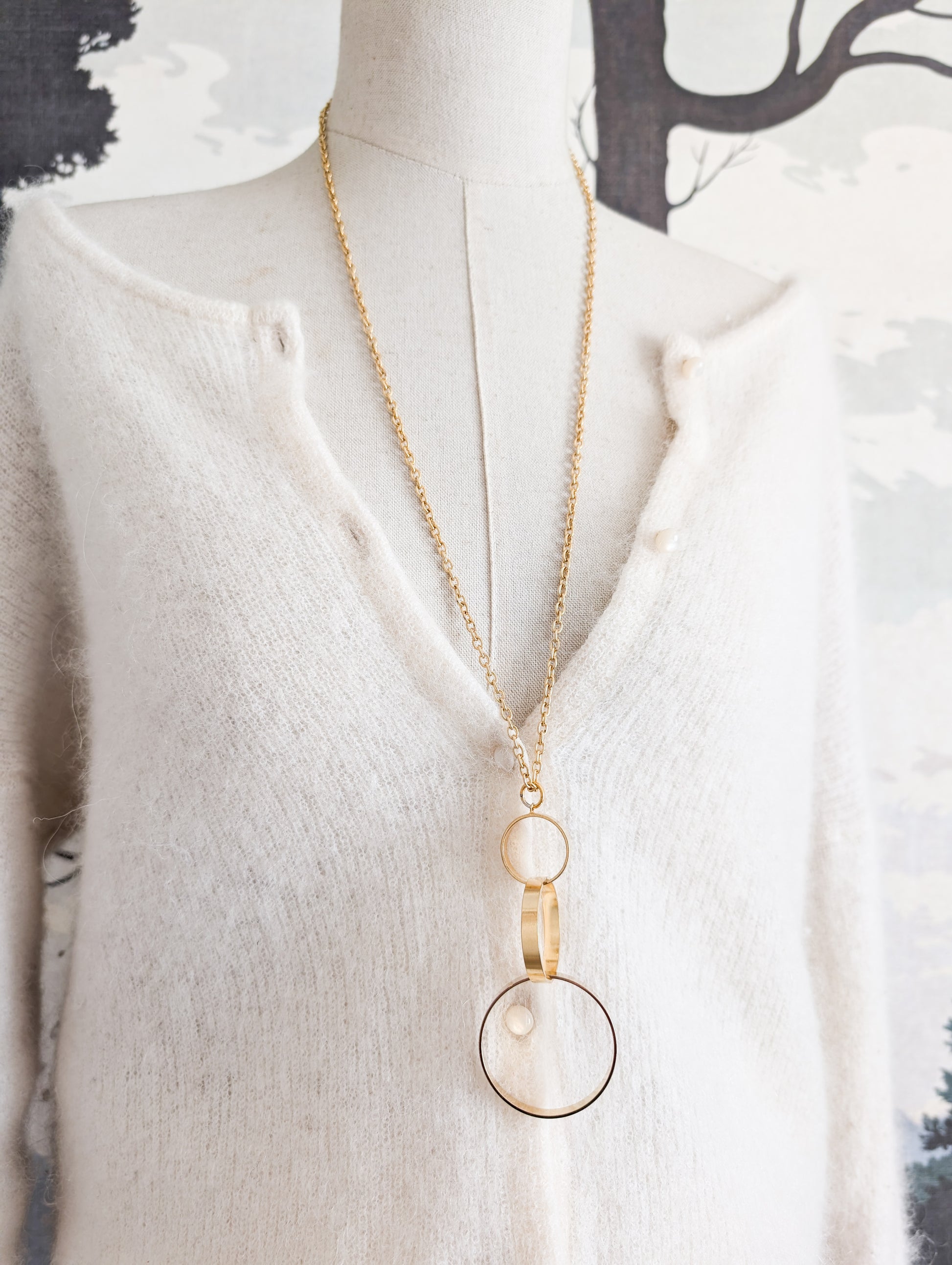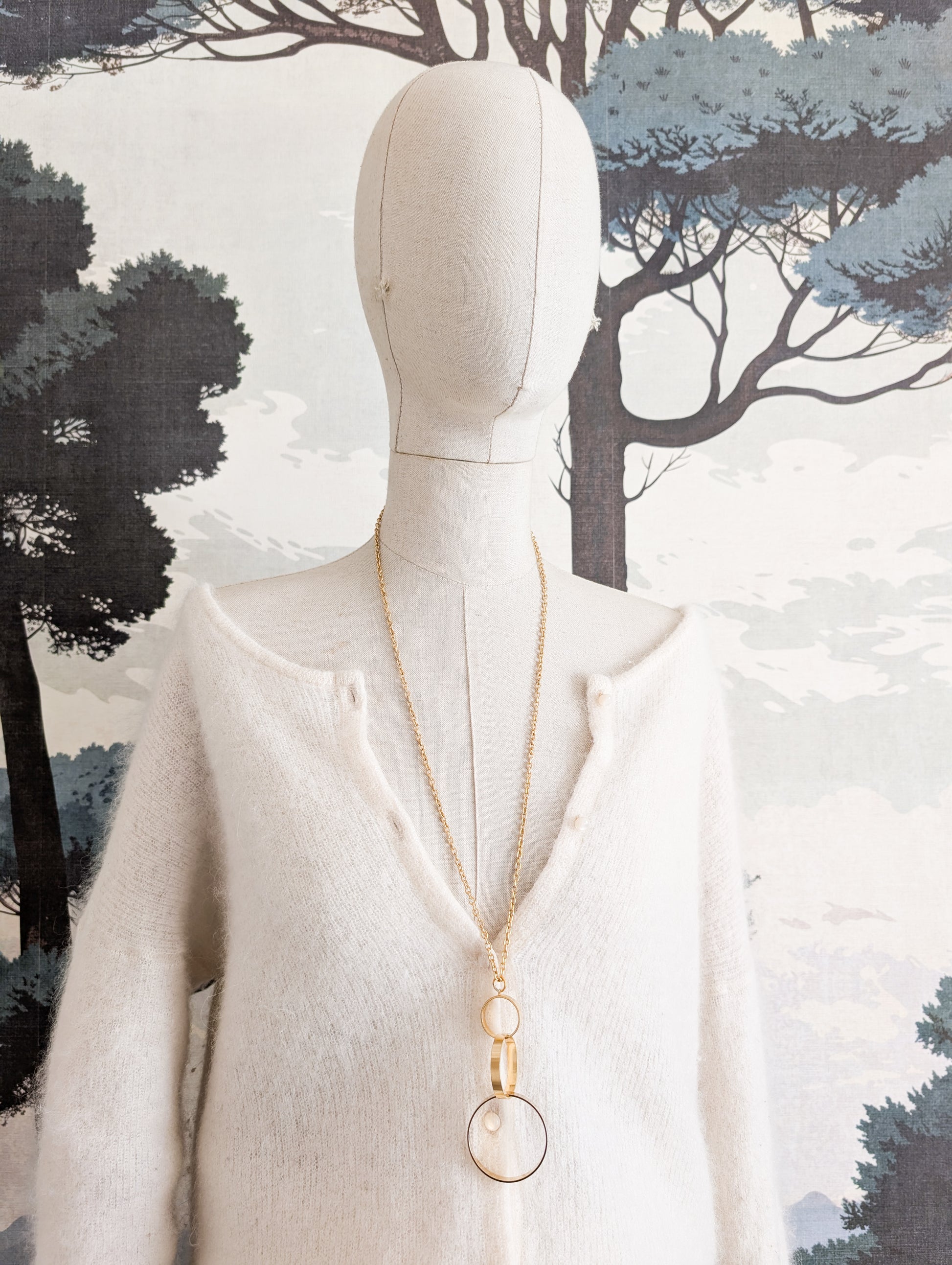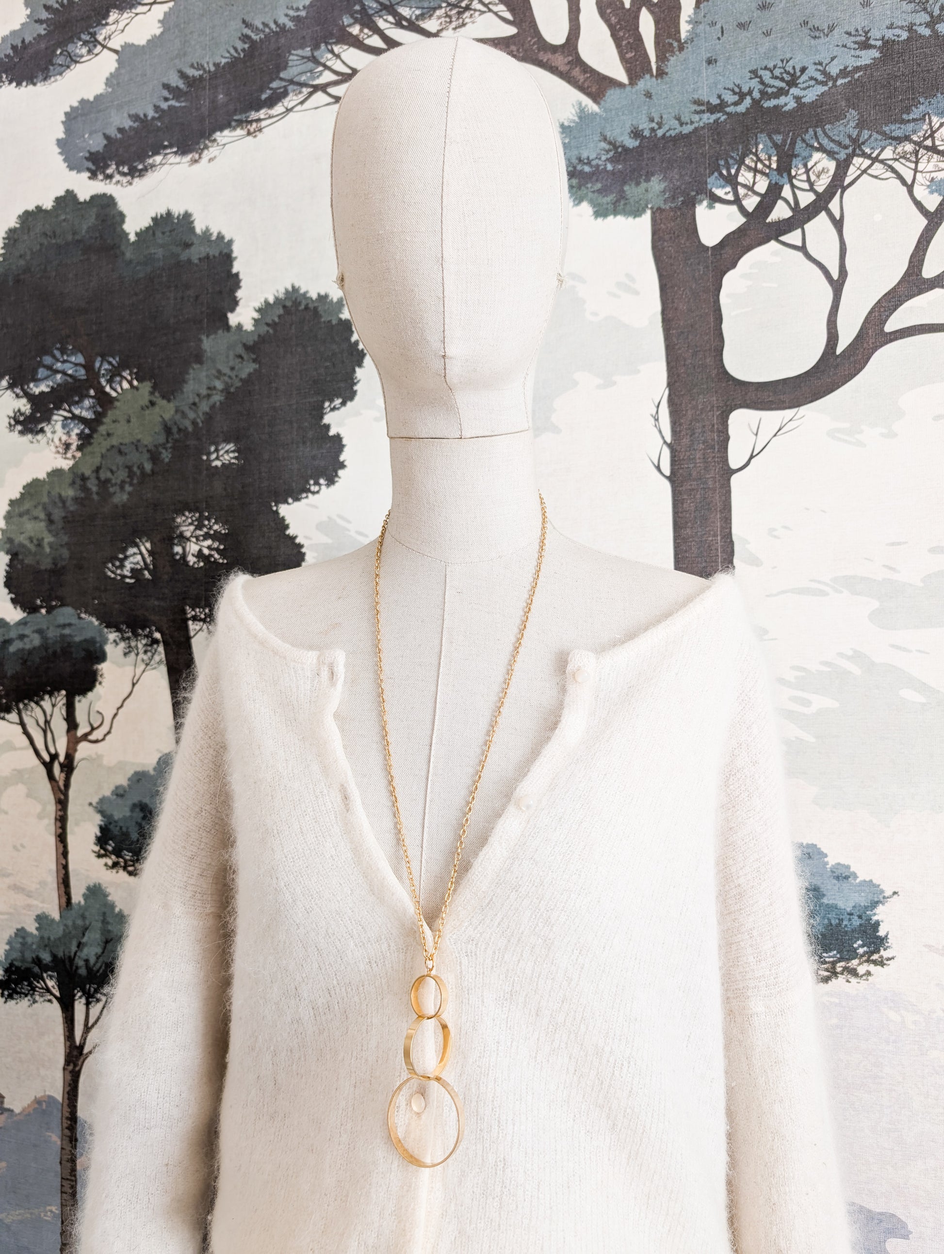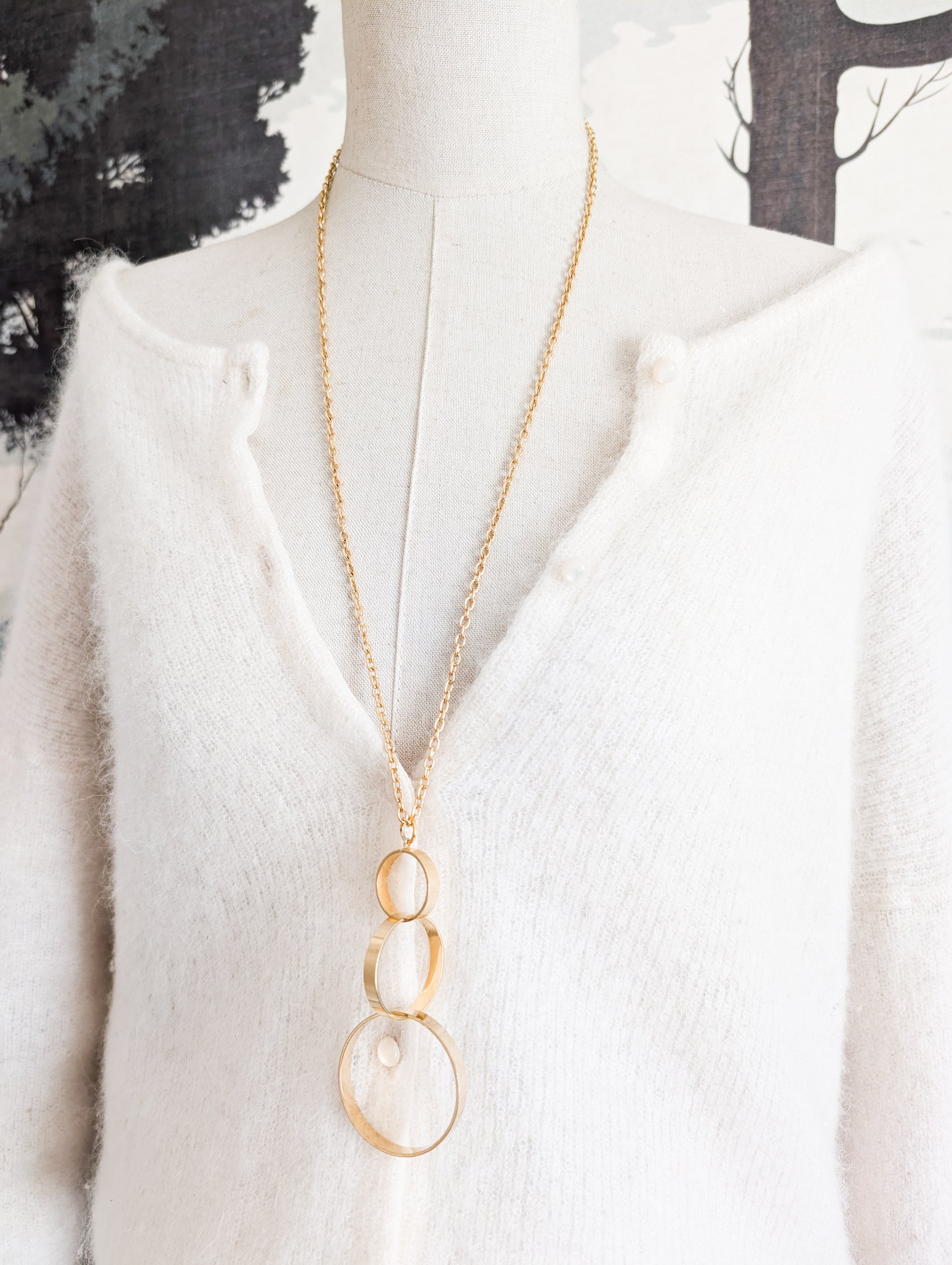 Le sautoir présente une longue chaînette dorée. Très joli pendentif composé de trois anneaux de tailles différentes qui s'entrelacent avec élégance.