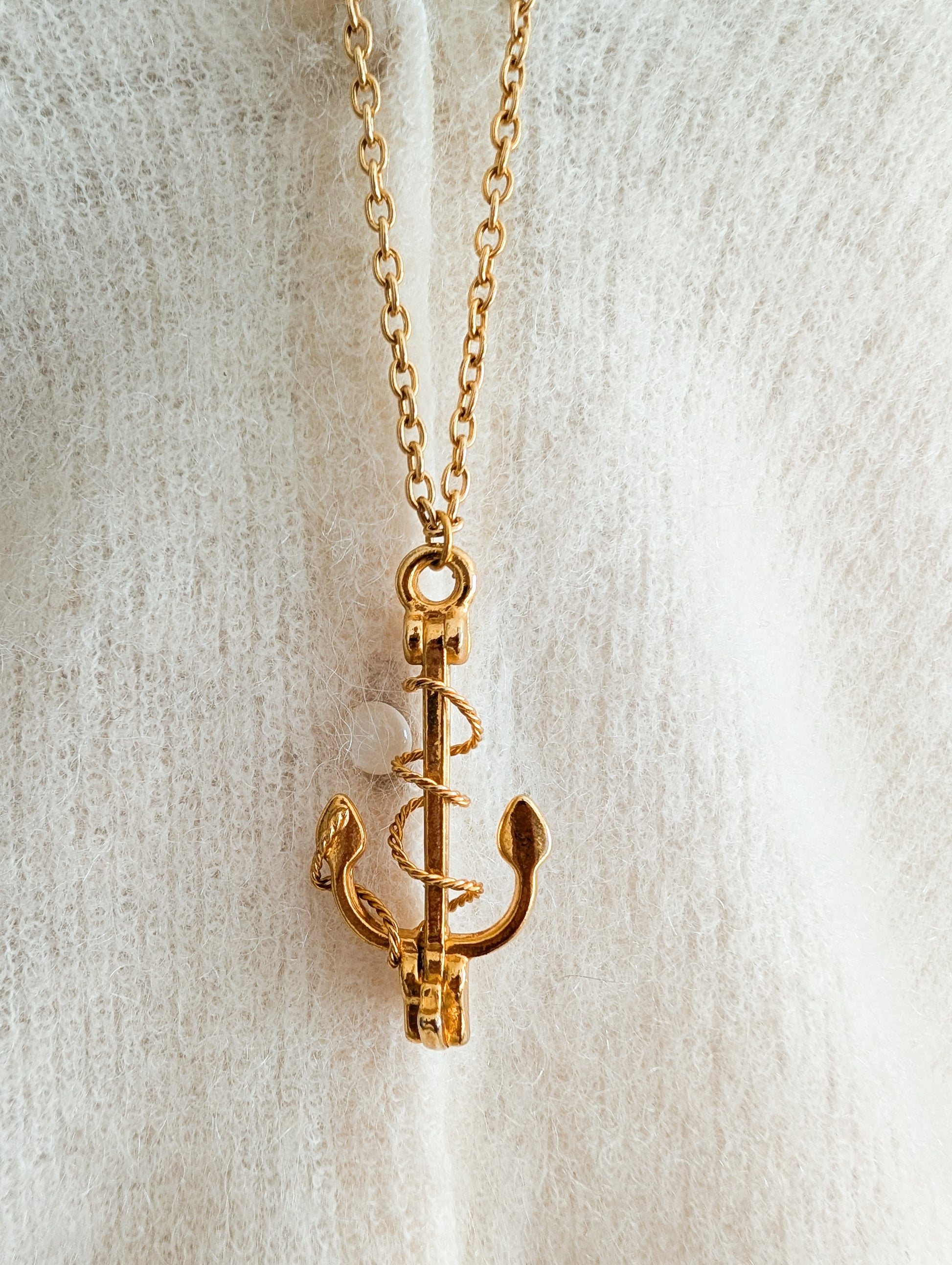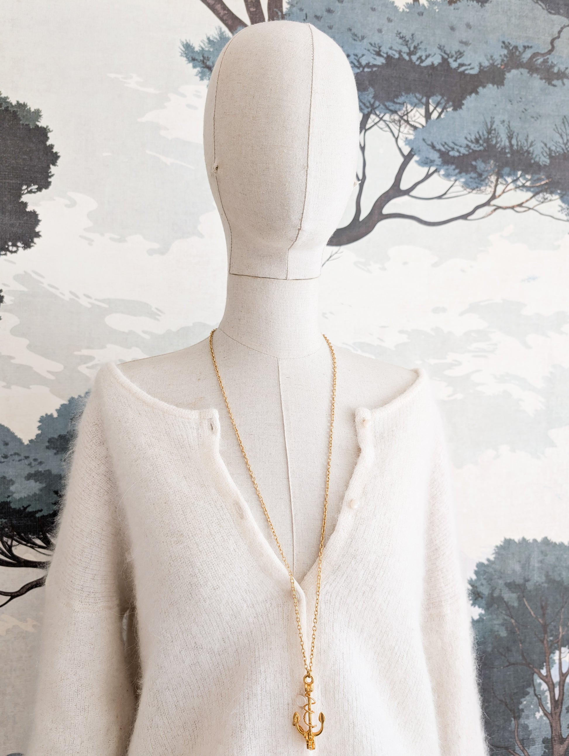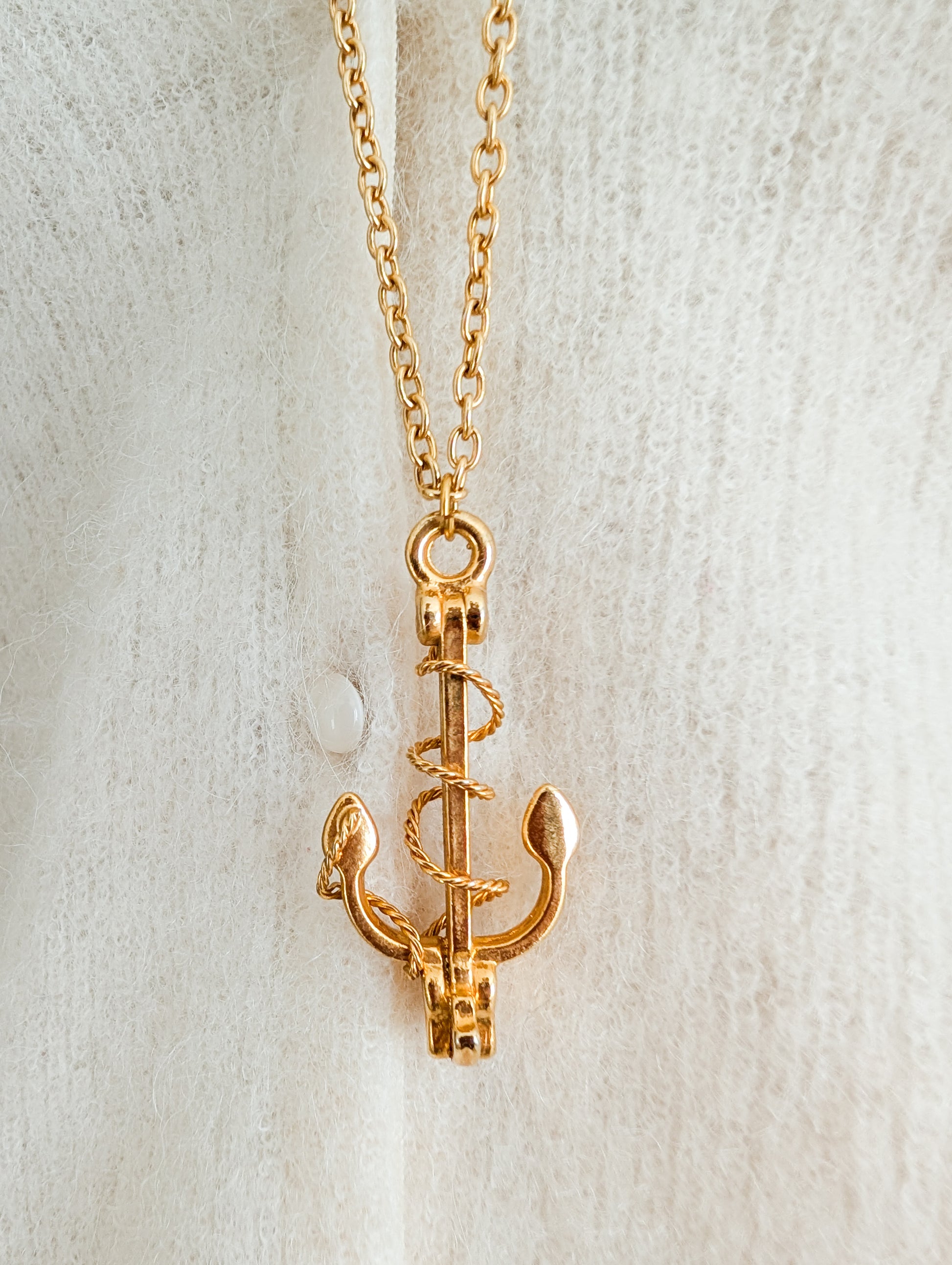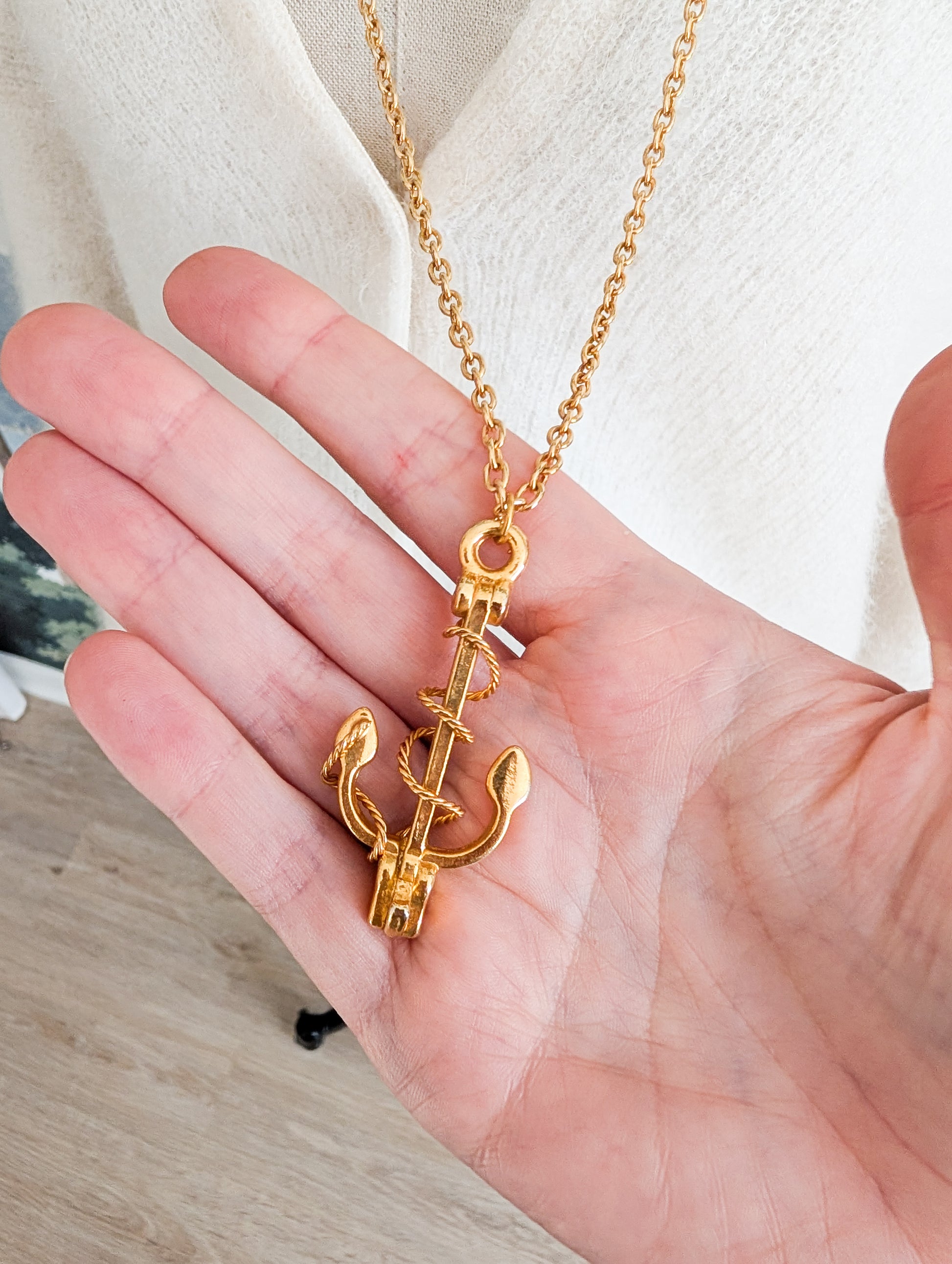 Sur une longue chaînette, une très belle ancre délicatement travaillée. Une corde s'enroule autour de l'ancre.