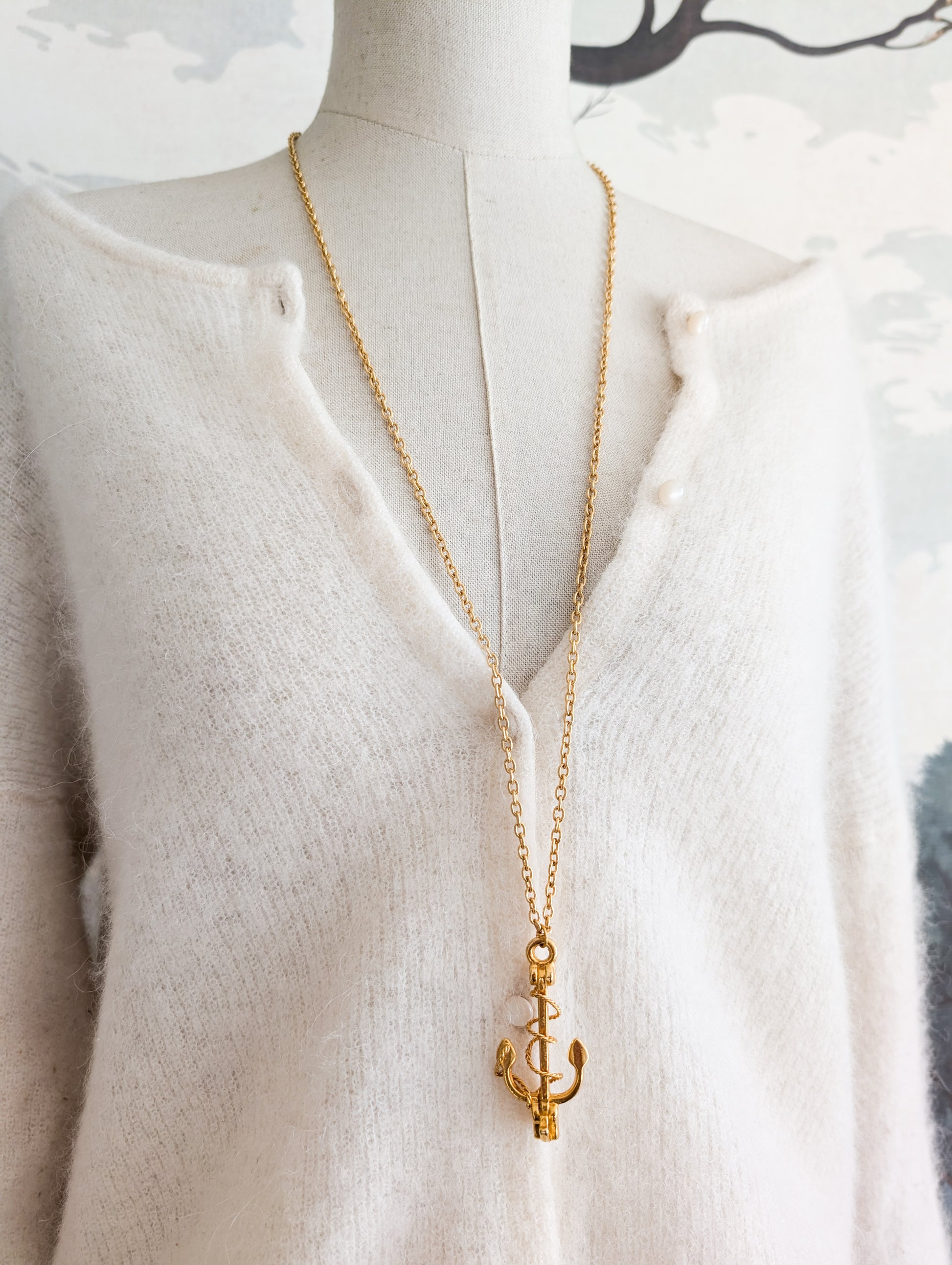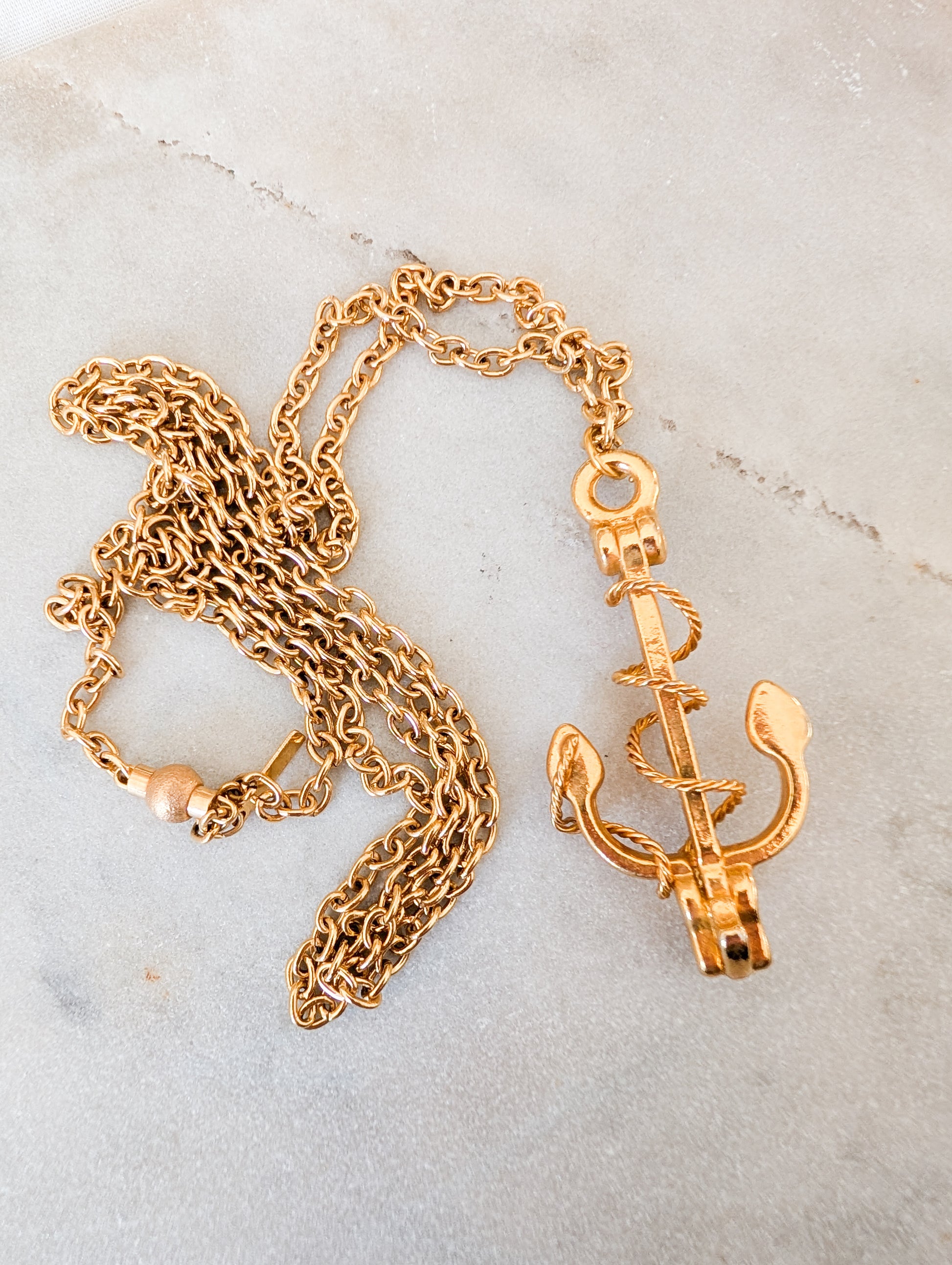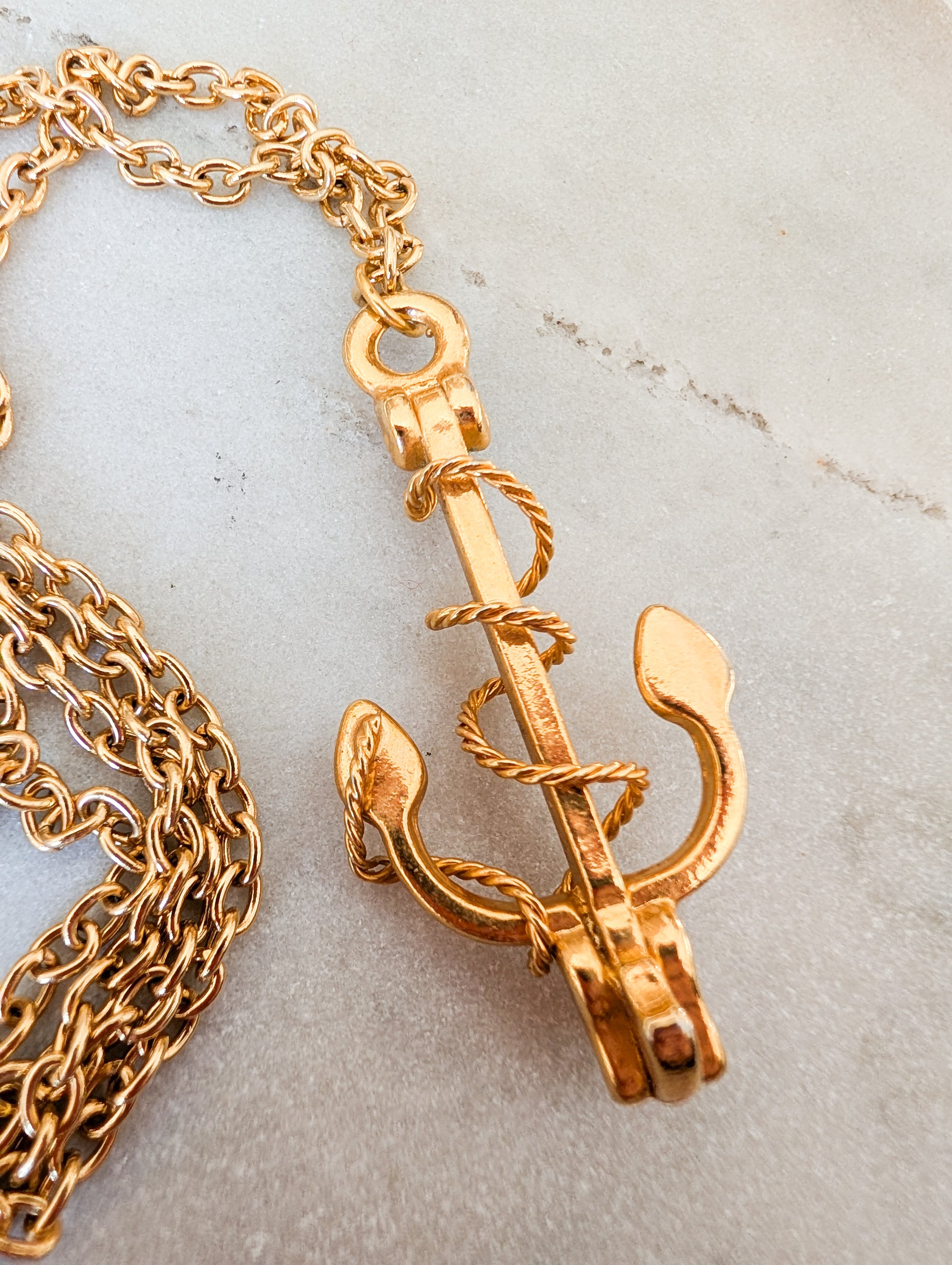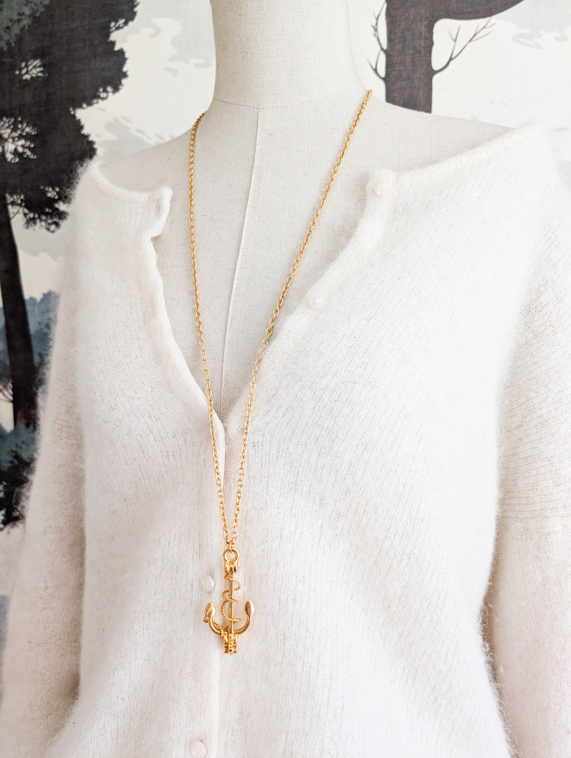 Sur une longue chaînette, une très belle ancre délicatement travaillée. Une corde s'enroule autour de l'ancre.