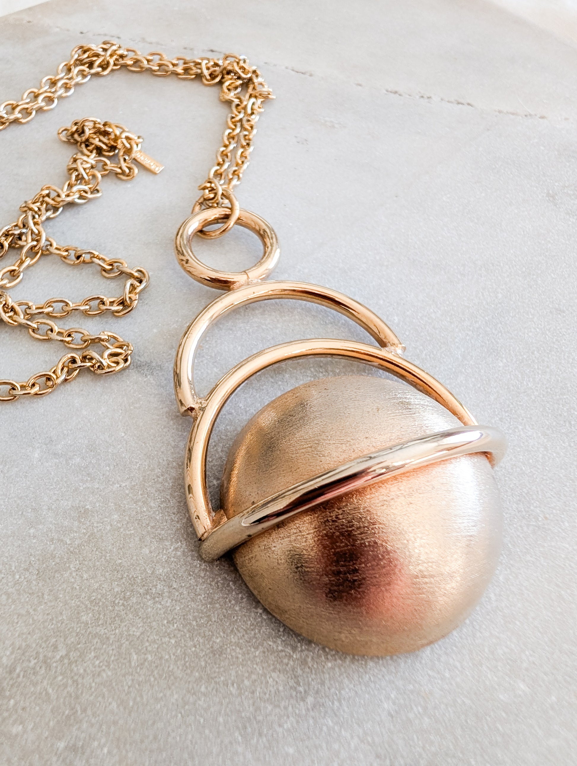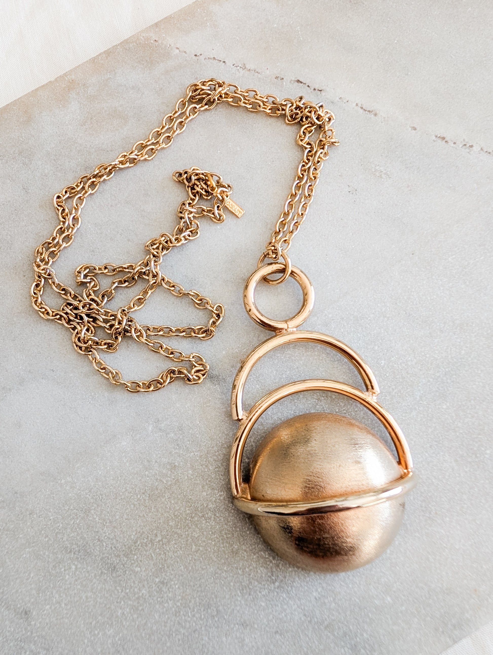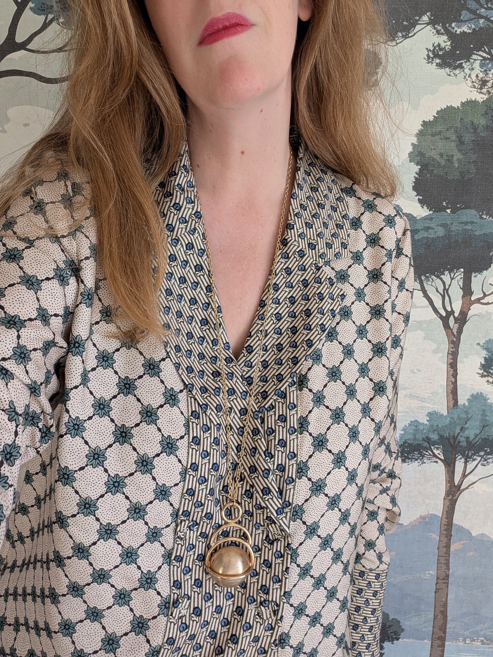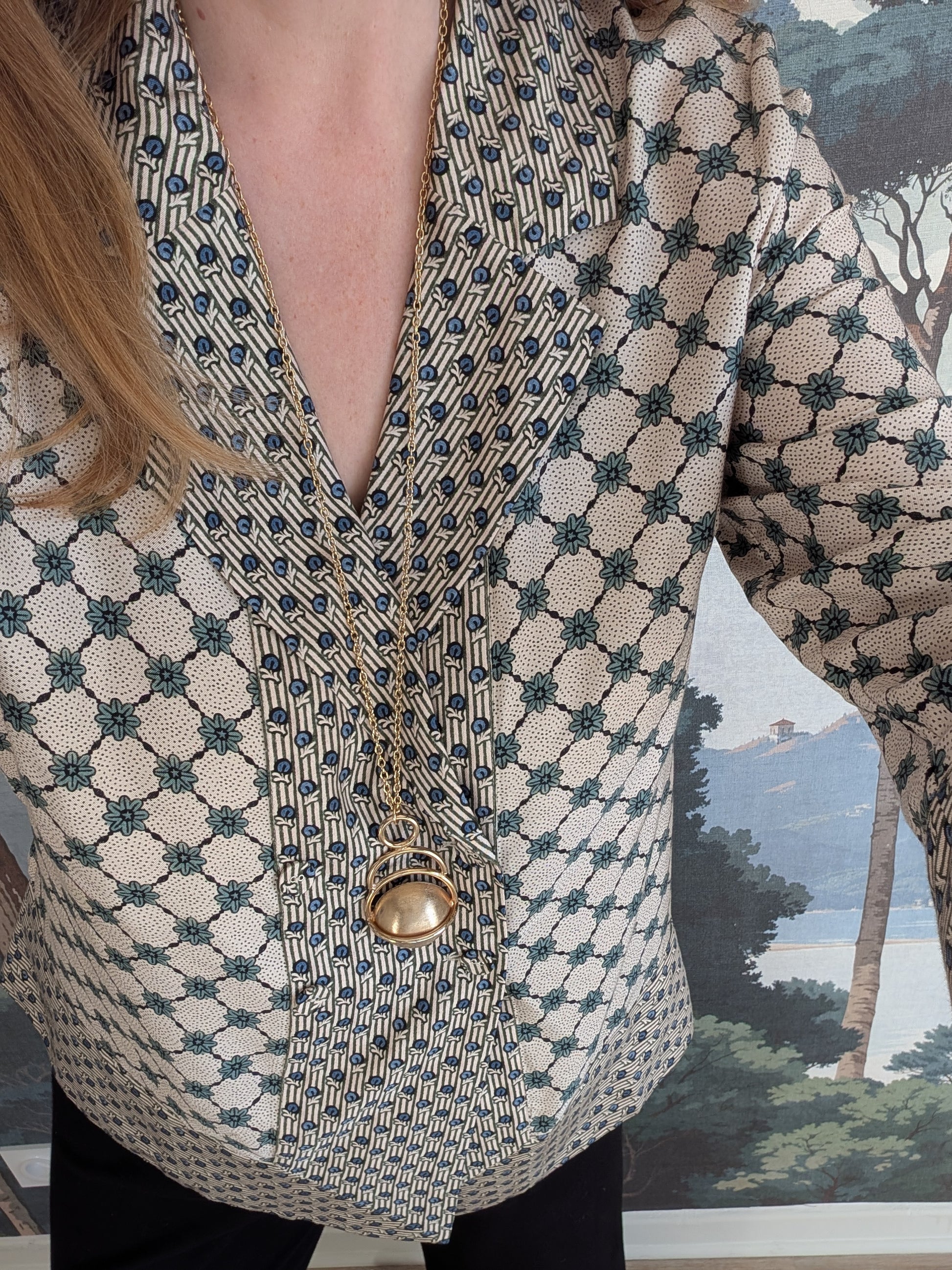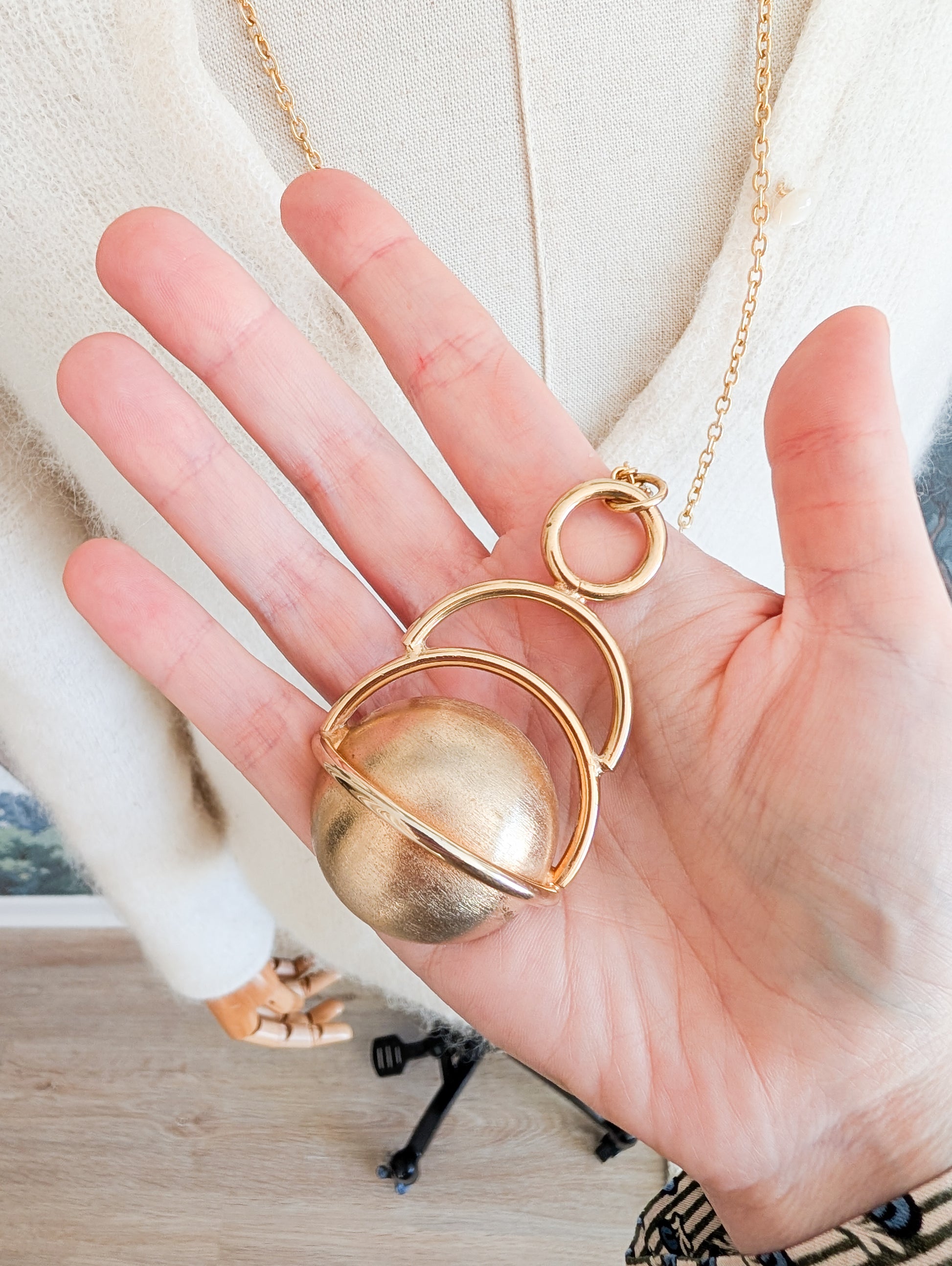 Le collier présente une très longue chaînette avec un grand pendentif. Tout à fait dans le goût des bijoux des années 70!