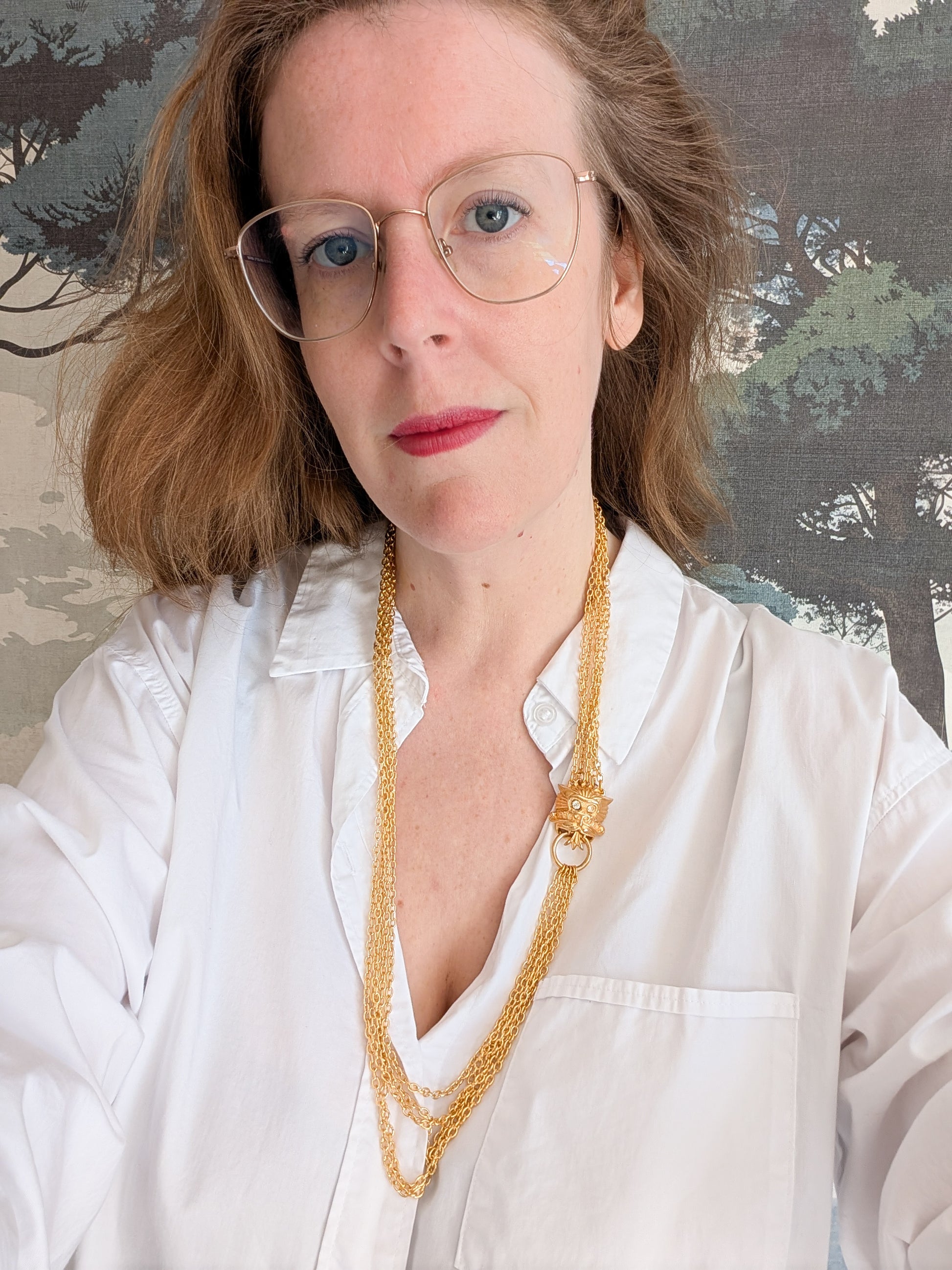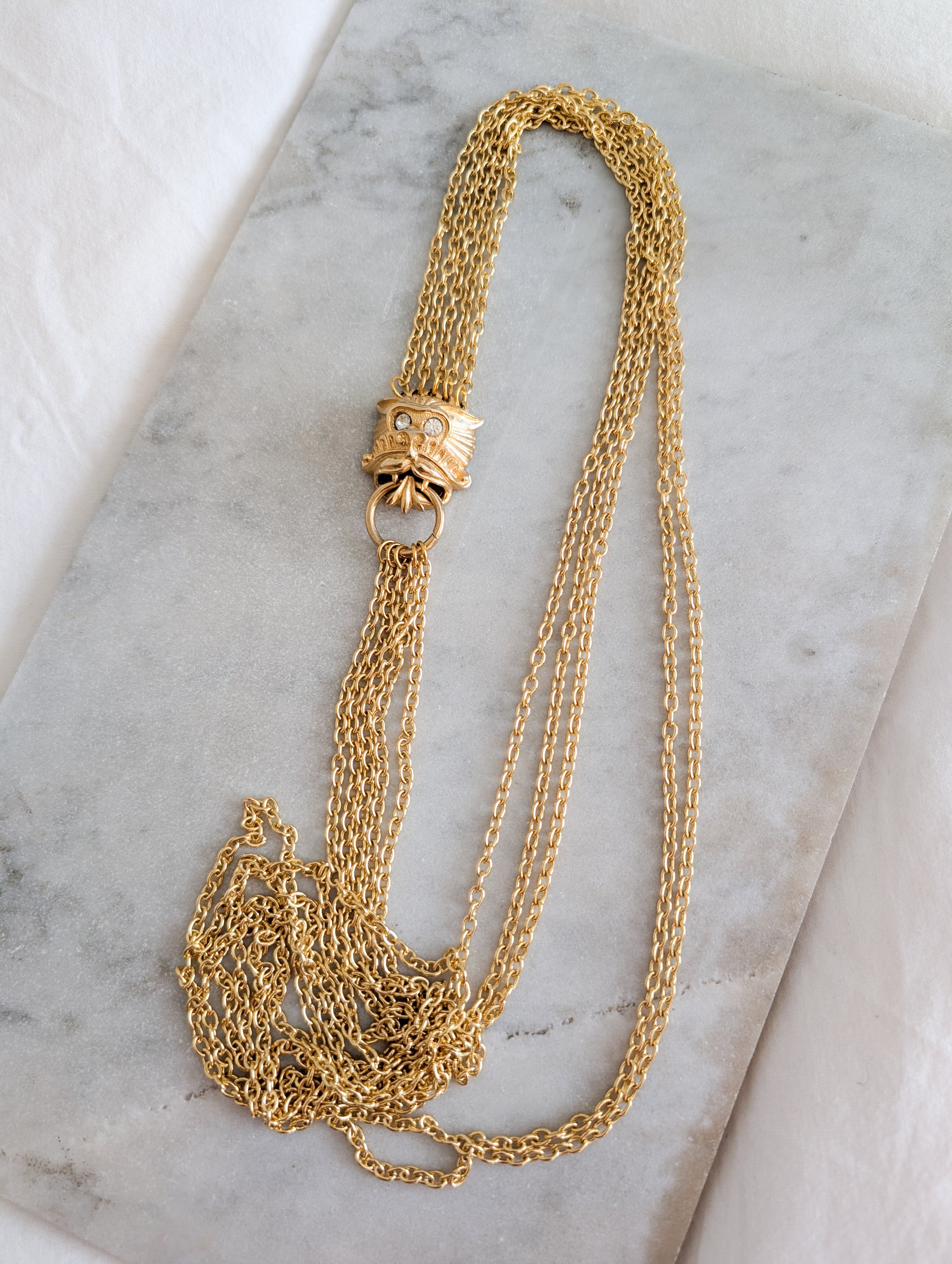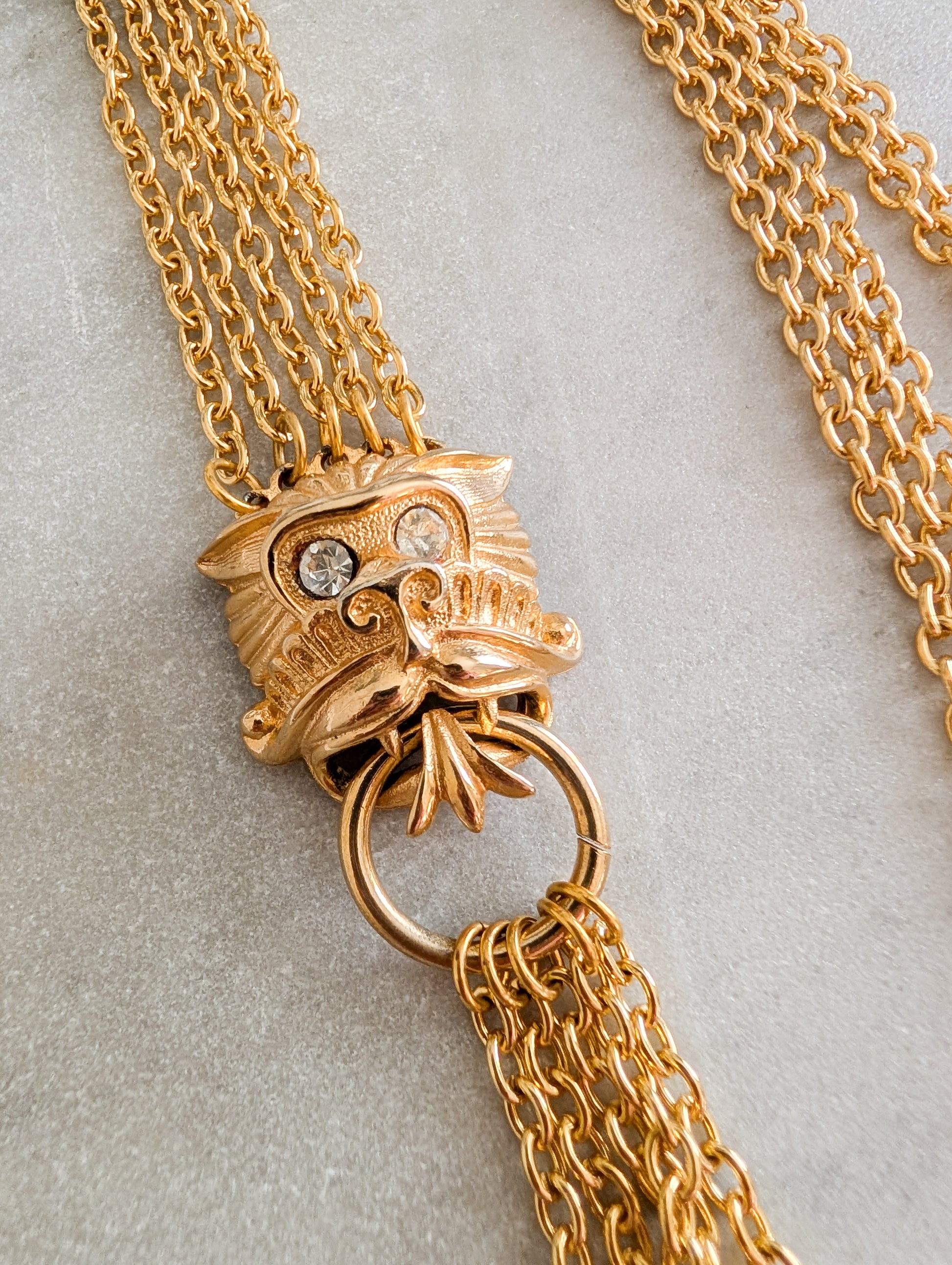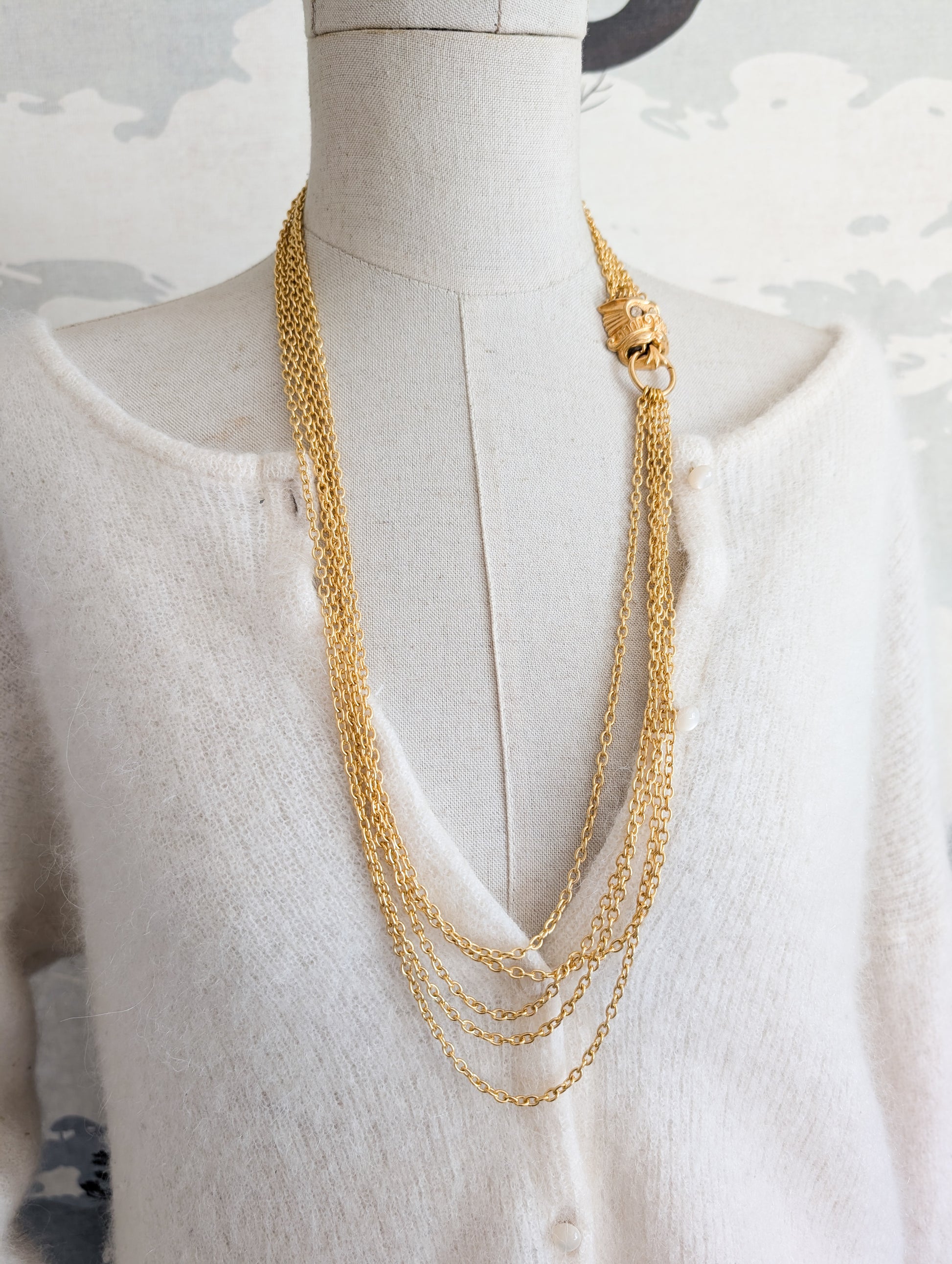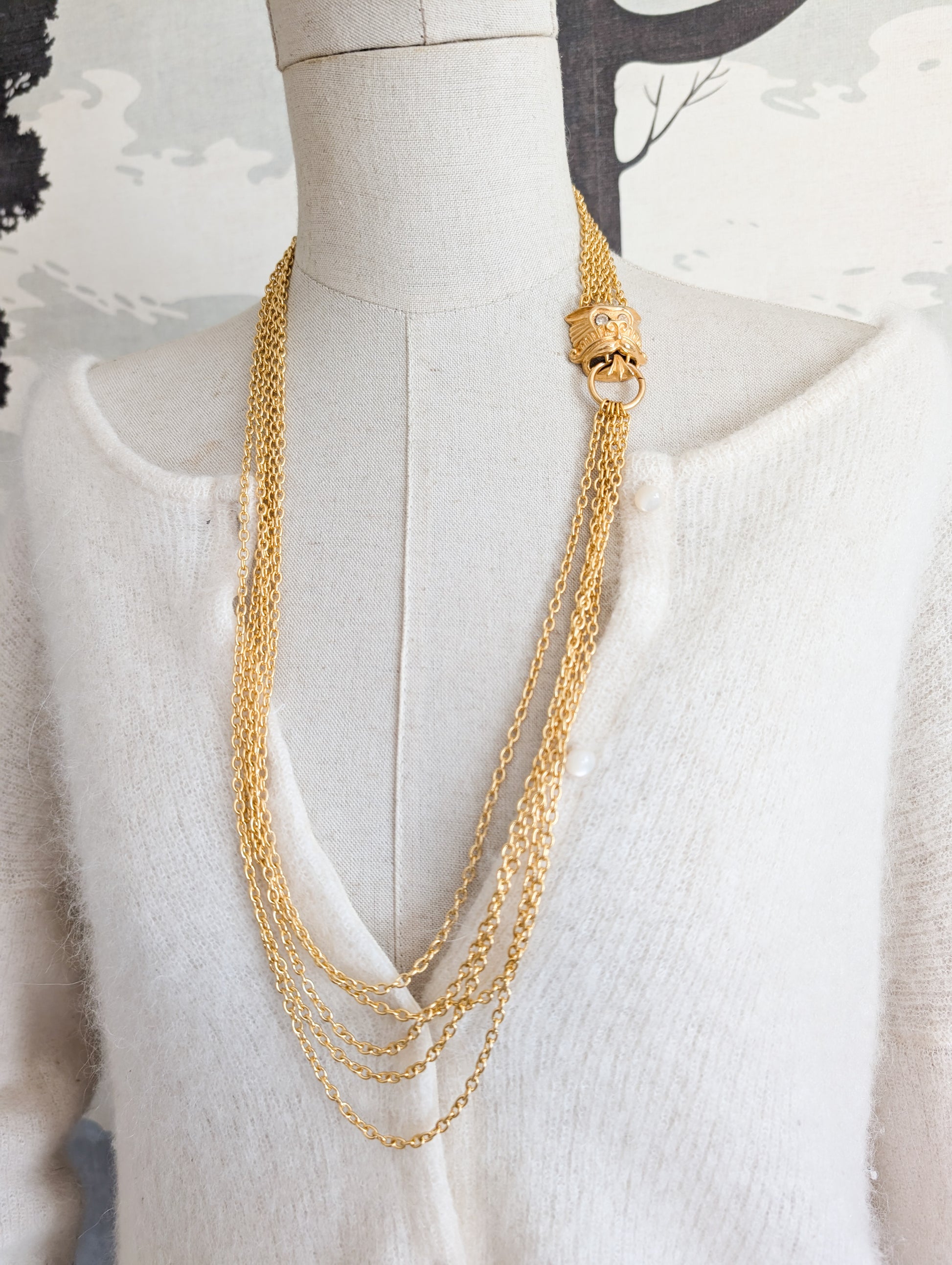 Le sautoir présente plusieurs rangs de chaînettes dorées. Il est orné d'une superbe tête de dragon en métal doré finement travaillée.