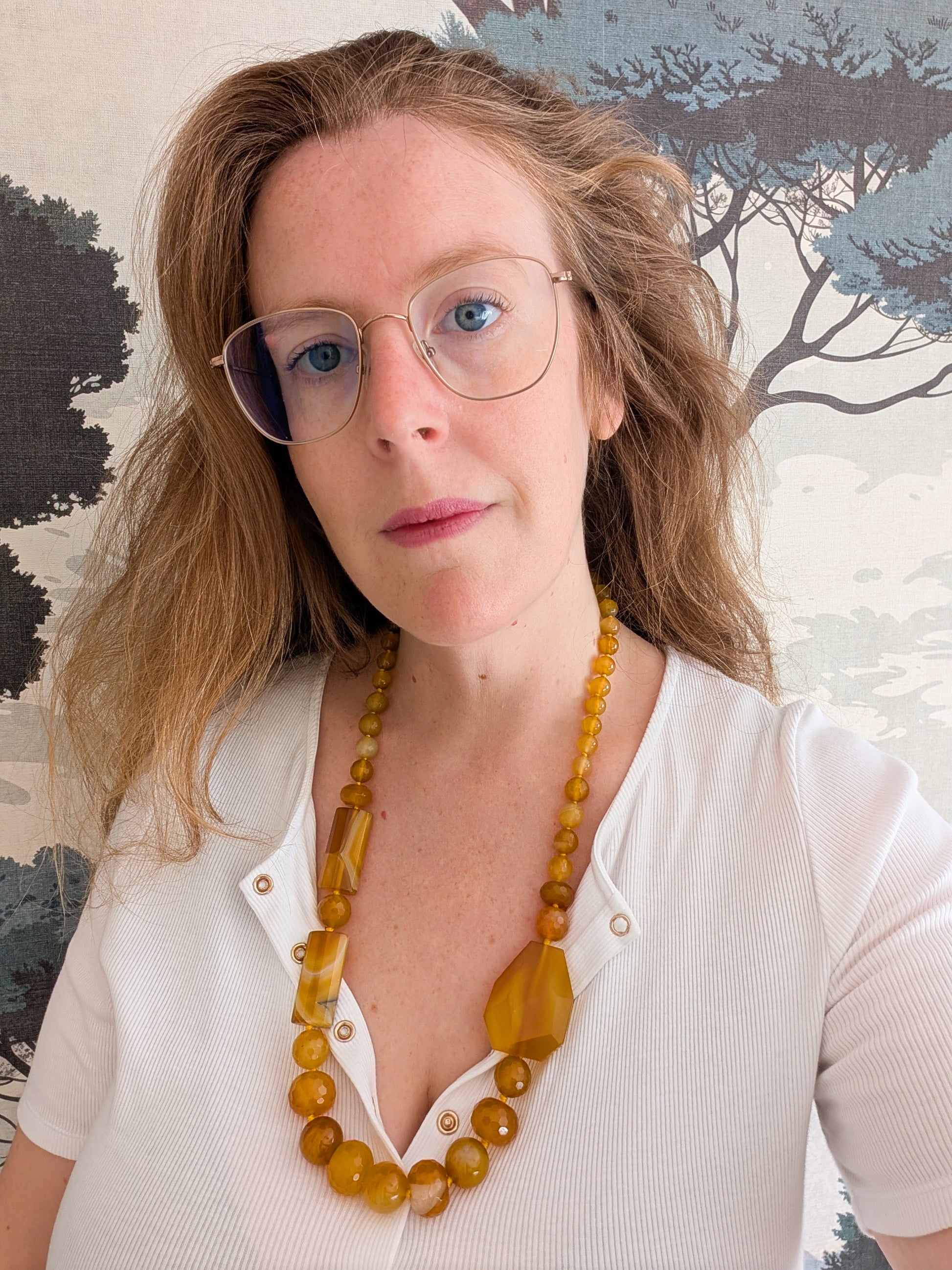 Le jaune de l'agate est absolument superbe, comme du miel 🌞 c'est une pièce très lumineuse, magnifique portée seule ou avec des bijoux dorés.