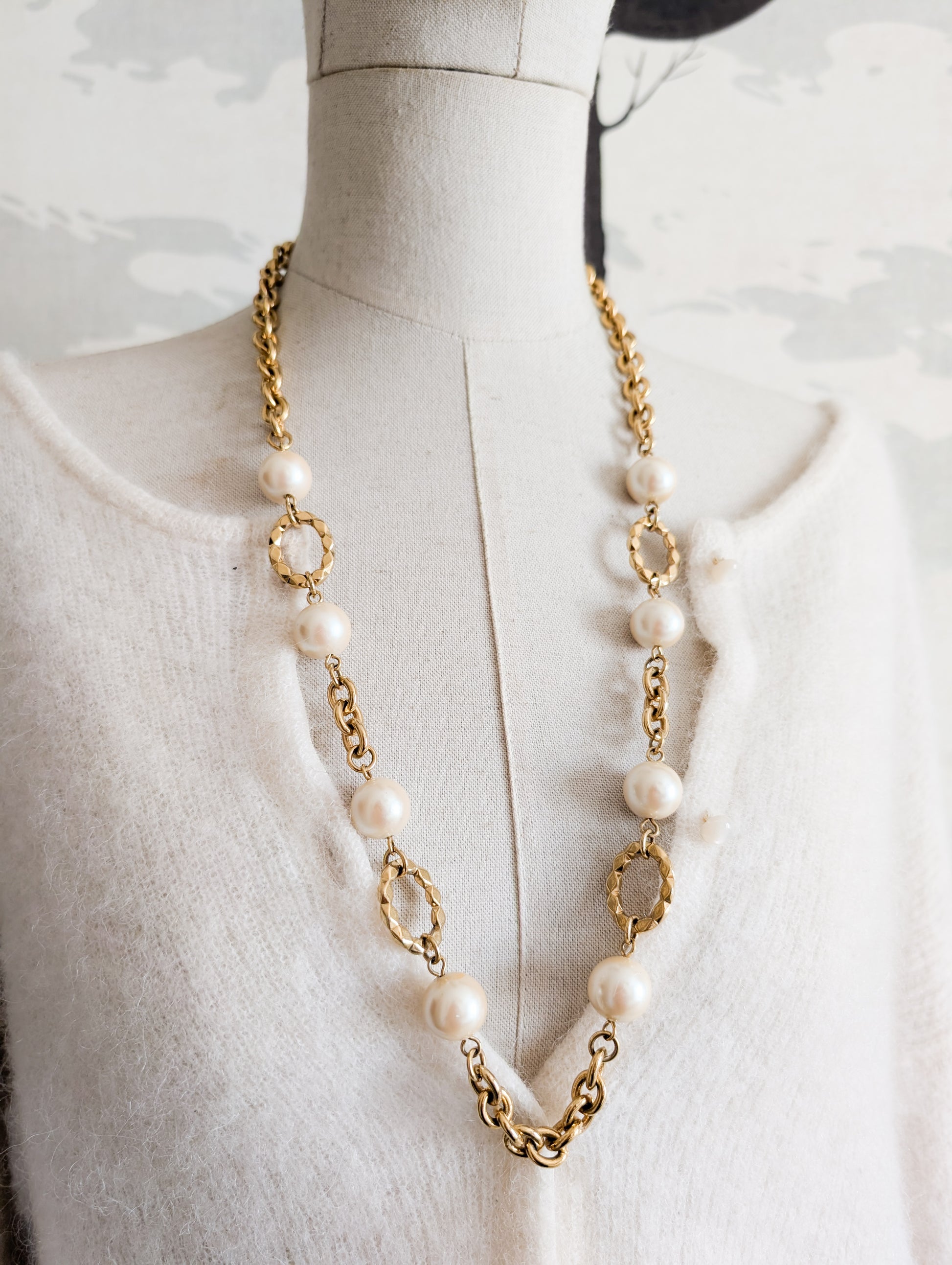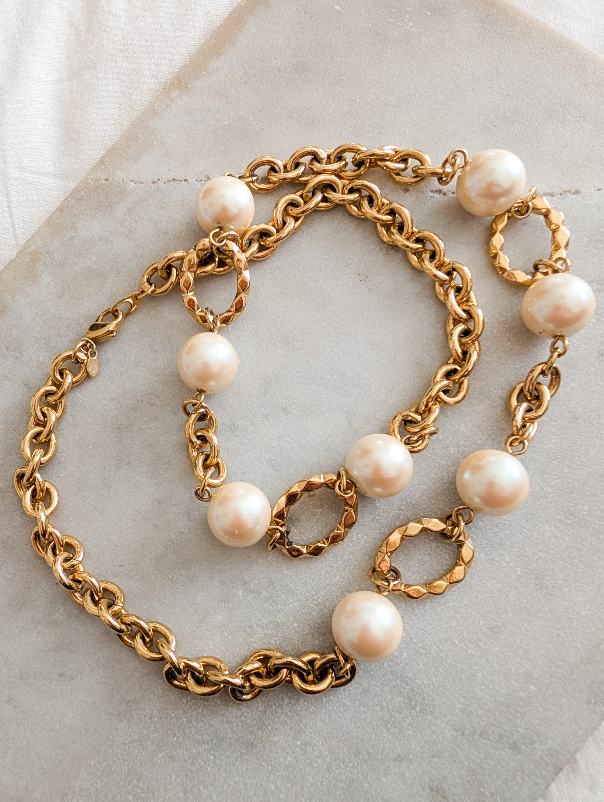 Le collier présente une belle maille forçat avec de grandes perles fantaisies nacrées en résine et des anneaux dorés.