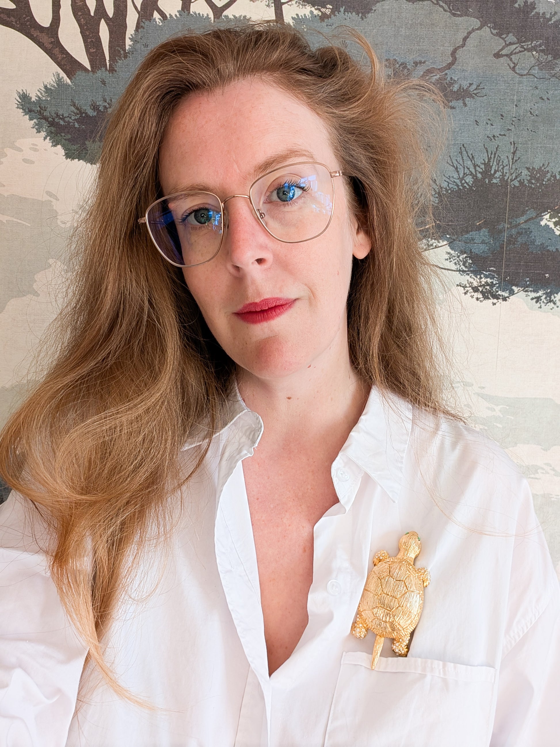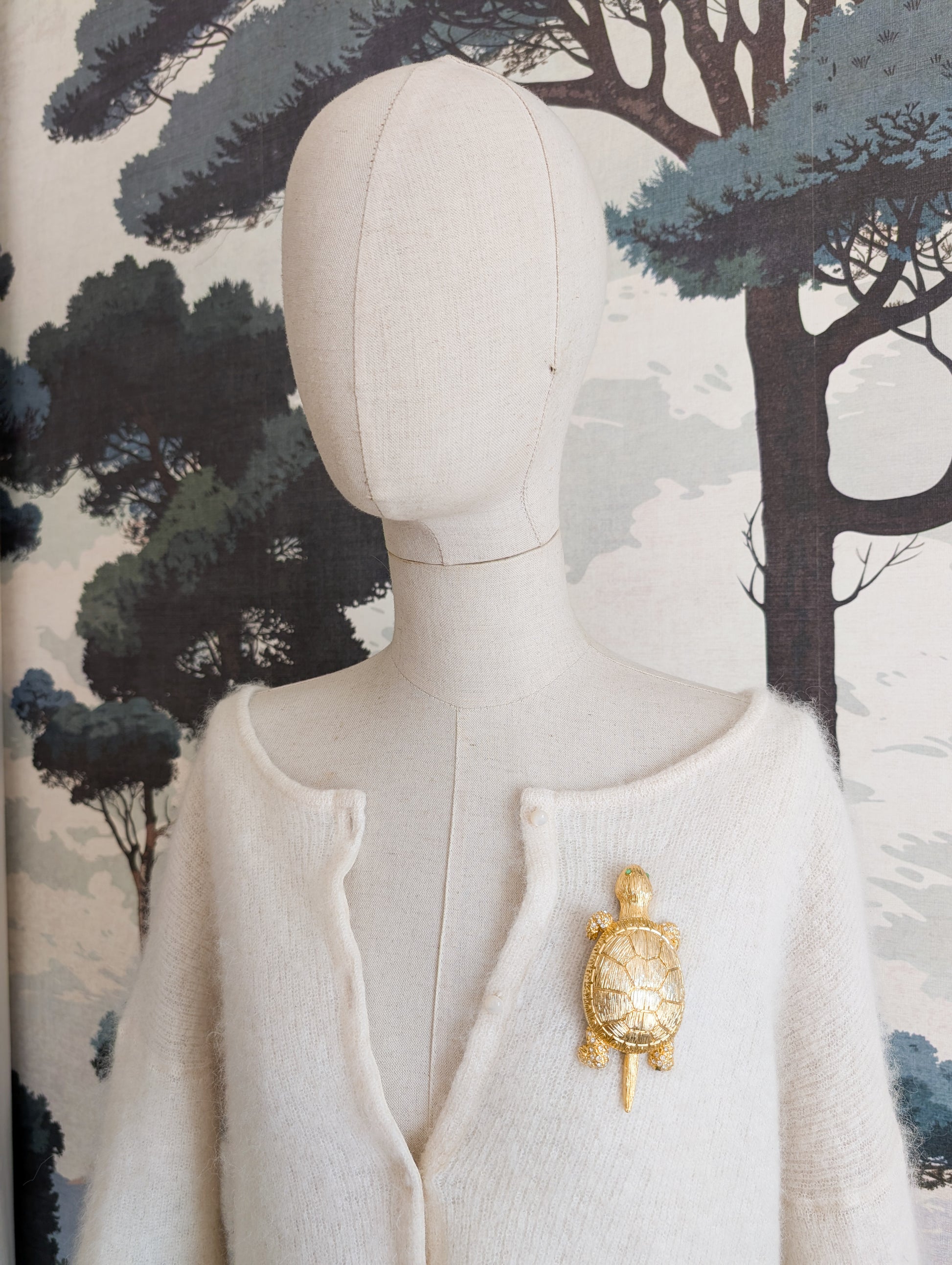 La broche est en métal doré. Les yeux de la tortue sur figurés par 2 strass vert.